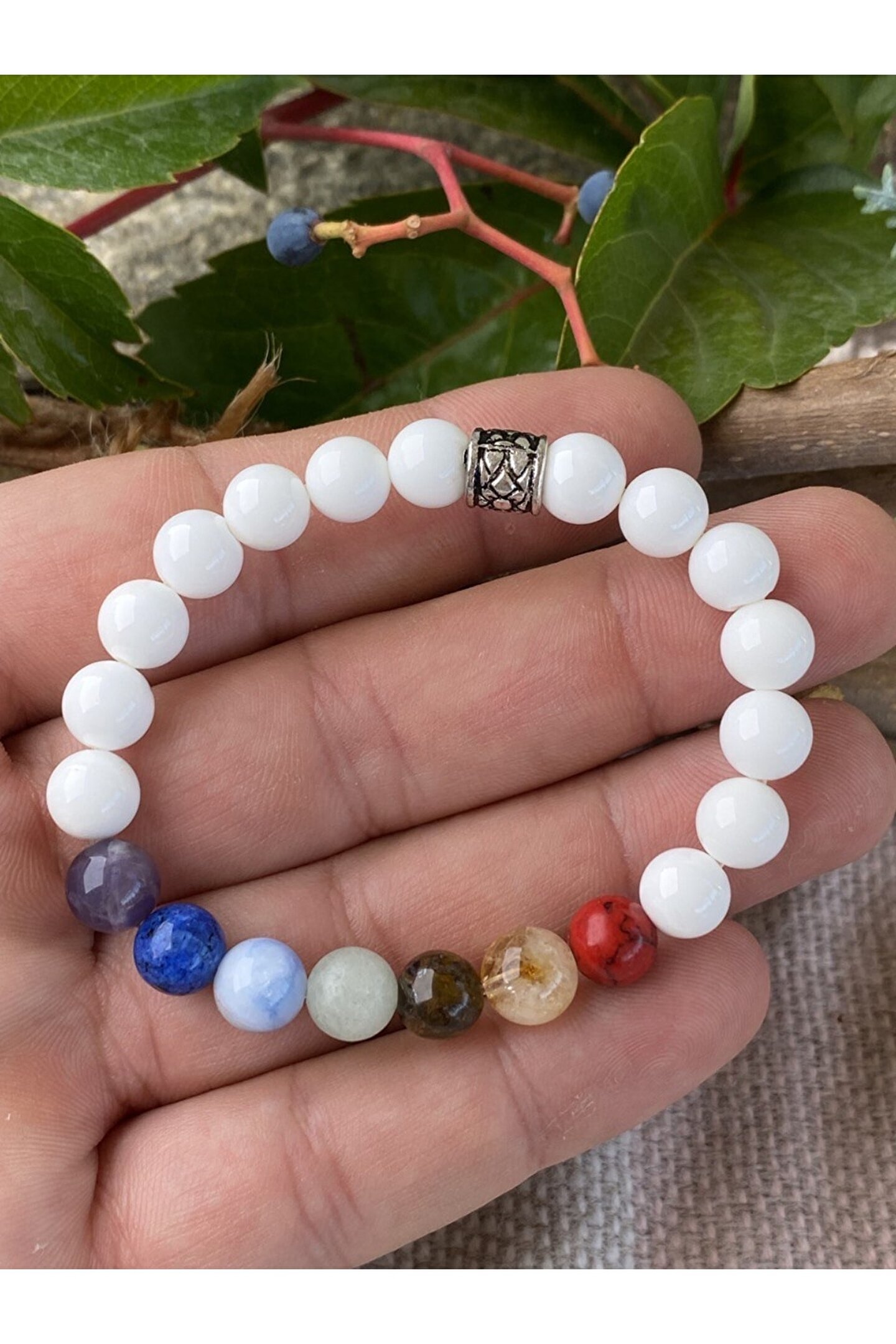 Doğal taş kullanımı sayesinde her bileklik benzersiz ve otantik bir görünüm sunar; Sedef taşı, bileklikte kullanılan ana malzeme olarak seçilmiştir, bu da hem şıklığı hem de zarafeti ön plana çıkarır; Doğal taşların enerji taşıma özellikleri ile çakra dengeleme ve pozitif enerji yayma etkisi sağlar;