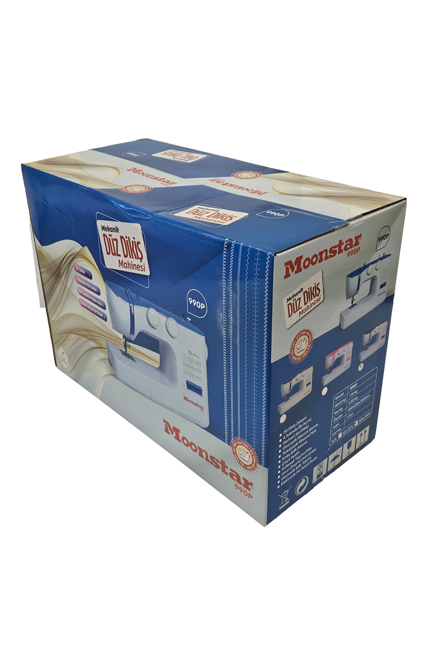 Makine Özellikleri: 6 mm genişliğinde zigzag yapabilme 36 farklı desen seçeneği Tek adımda ilik açabilme Esnek penye jarse kumaş dikebilme Otomatik iplik takabilme Led aydınlatma Pembe renk detayı,kumaş baskı basınç ayarı Ekstra baskı ayarı özelliği Desen seçme özelliği Ayarlanabilir dikiş uzunluğu,işaretli iplik geçirme yolları Geri dikiş, serbest kol dikişi,dişli düşürme,masura sarabilme İplik kesici İlik açabilme Düğme dikebilme Masura sarımı için otomatik kavrama Kutu Boyutları: 48x22; 5x34cm Brüt Ağırlık: 7; 1kg Net Ağırlık: 5; 8kg;