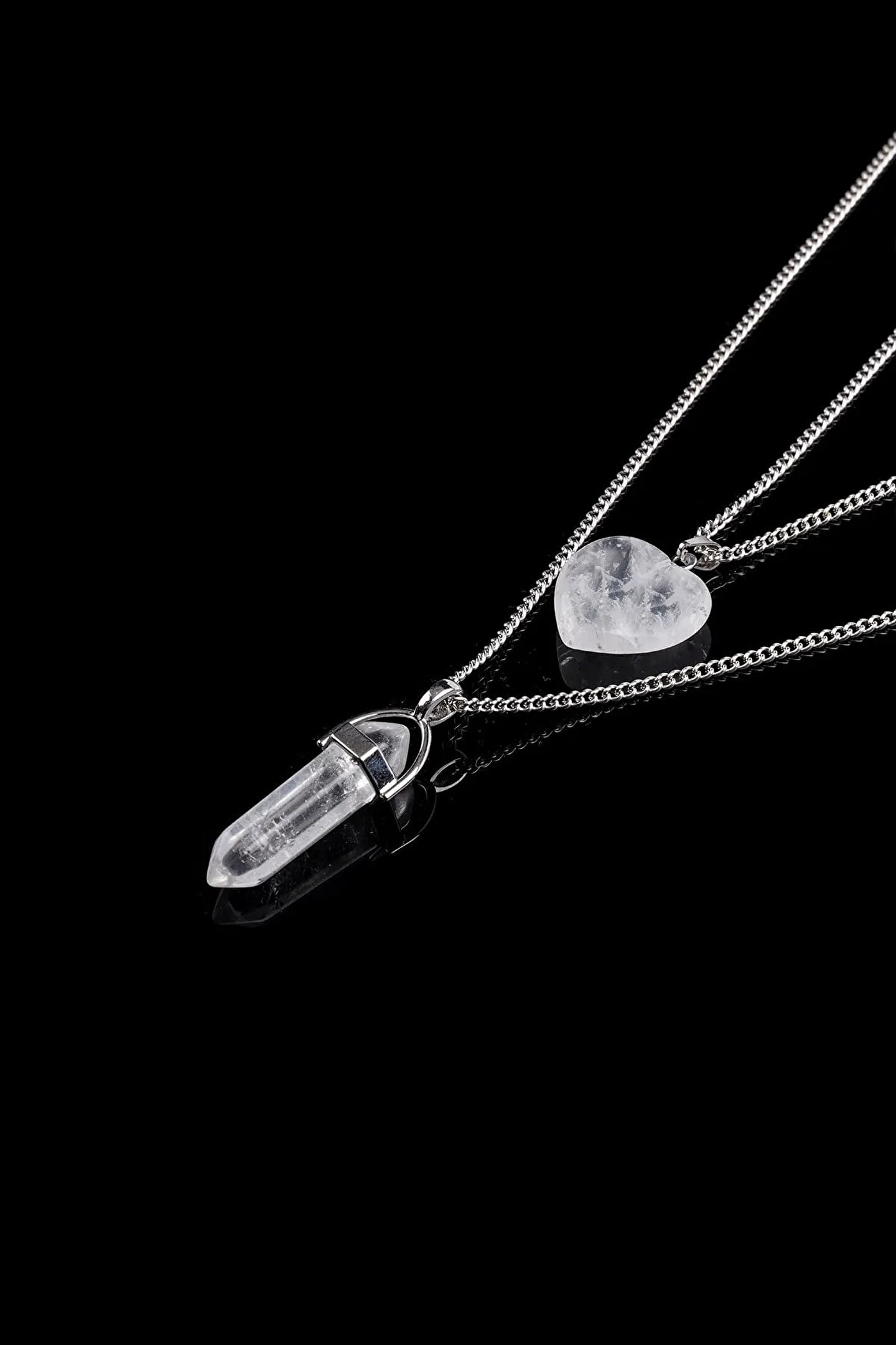 Doğal taş kullanımı sayesinde her kolye seti, benzersiz ve otantik bir görünüm sunar; Kristal kuvars taşı, hem şıklığı hem de zarafeti bir arada barındırarak her kıyafetle uyum sağlar; Kalp ve çivi kesim detayları, kolye setine modern ve estetik bir dokunuş katarken, kişisel tarzınızı yansıtmanızı sağlar; Taşın parlaklığı ve canlı rengi ile göz alıcı bir etki yaratır ve her ortamda dikkat çekmenizi sağlar;
