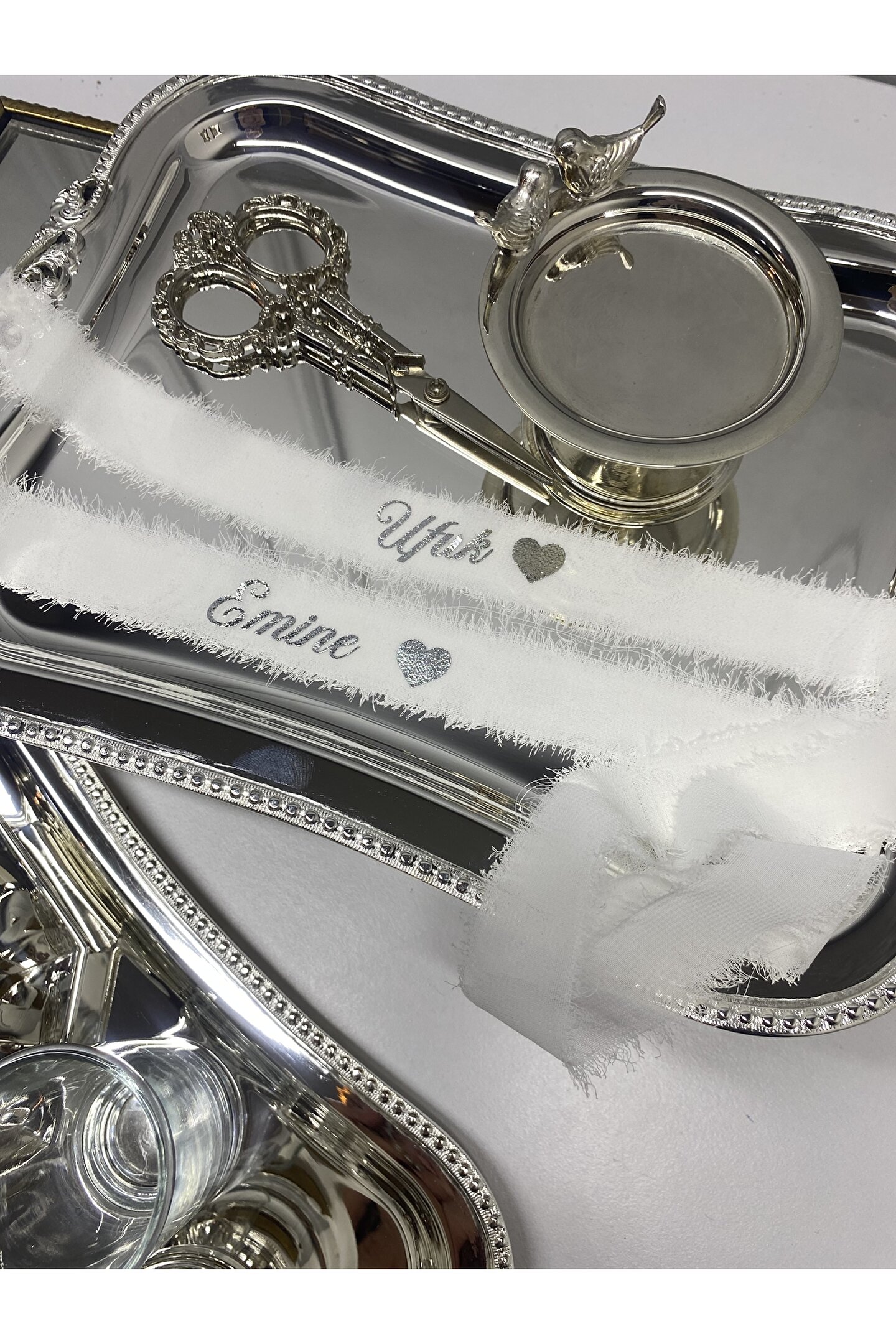 Ürün 1m -1,10cm uzunluğundadır . ; Krem ipek kurdele üzerine gümüş baskılı yapılmıştır. ; Yüzükleriniz cırtı ile kolaylıkla takılabilmektedir. ; Sipariş verdikten sonra sipariş numaranız ile birlikte üzerine yazılmasını istediğiniz isimleri satıcıya sor kısmında bize iletmeniz durumunda siparişiniz istediğiniz gibi hazırlanacaktır.;