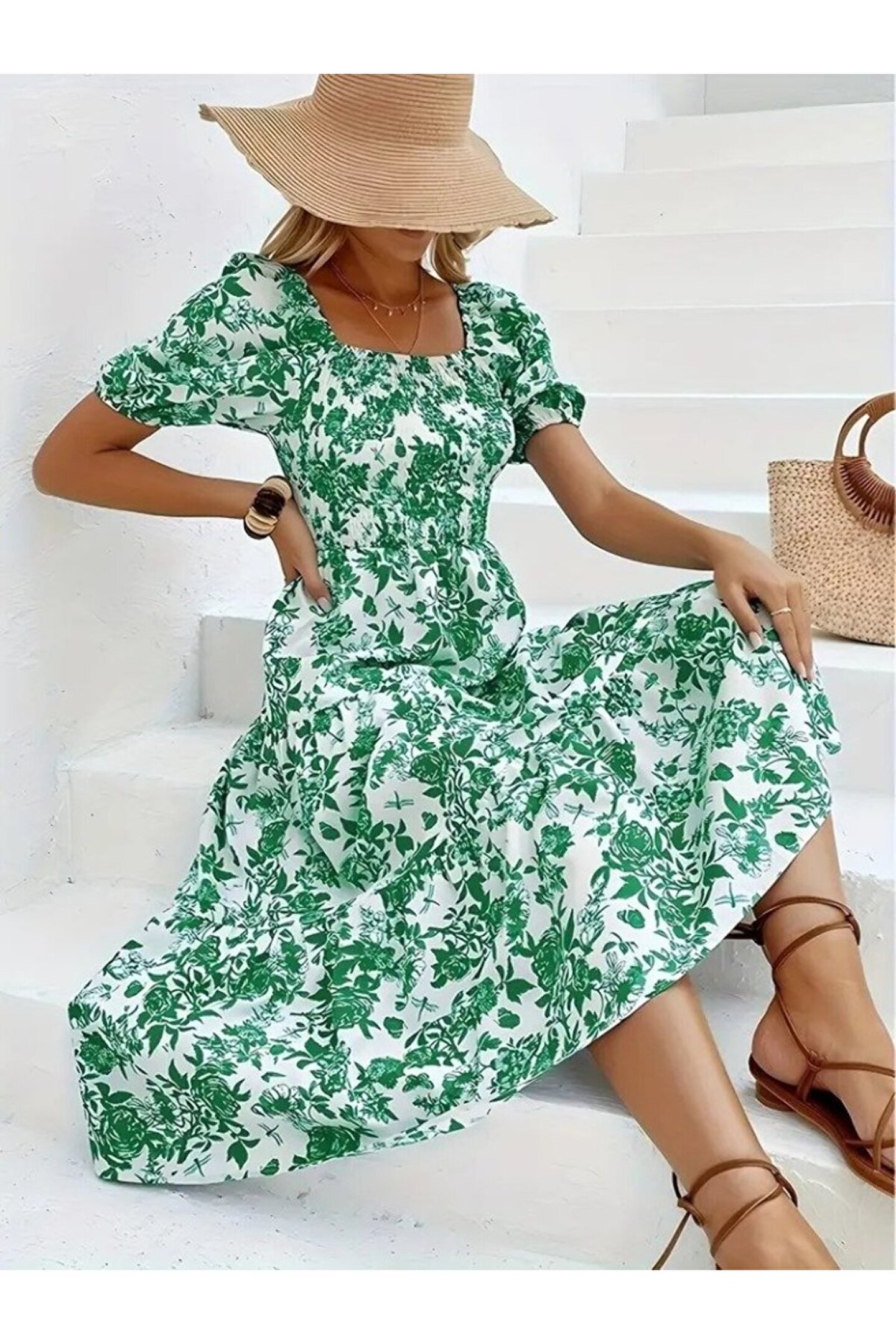 Edolika Kadın Kısa Kollu Kare Yakalı Lastikli Desenli Süprem Elbise