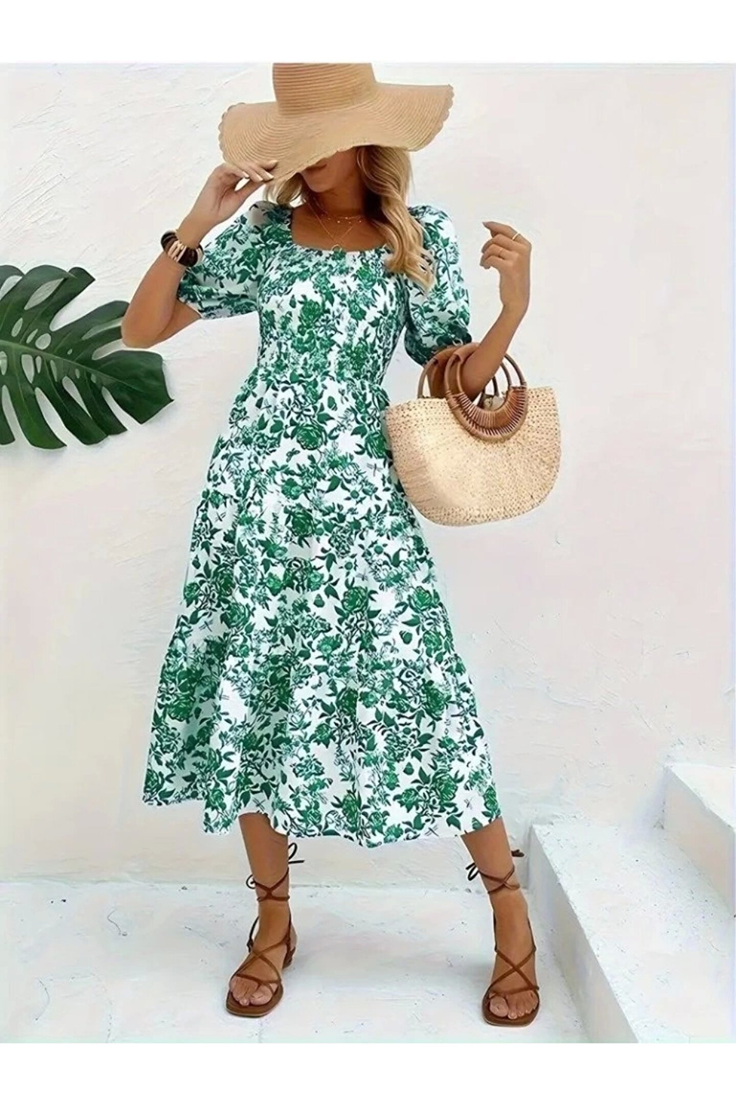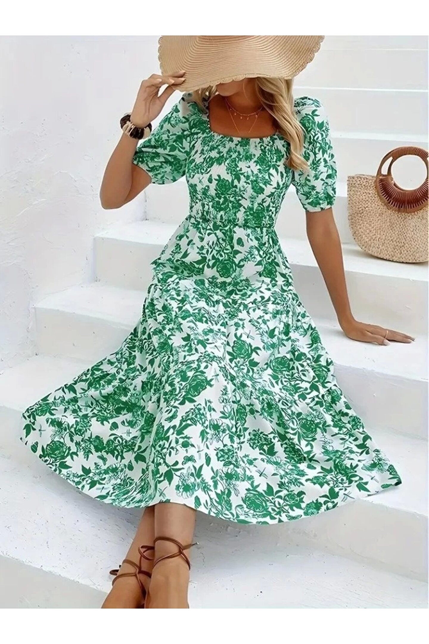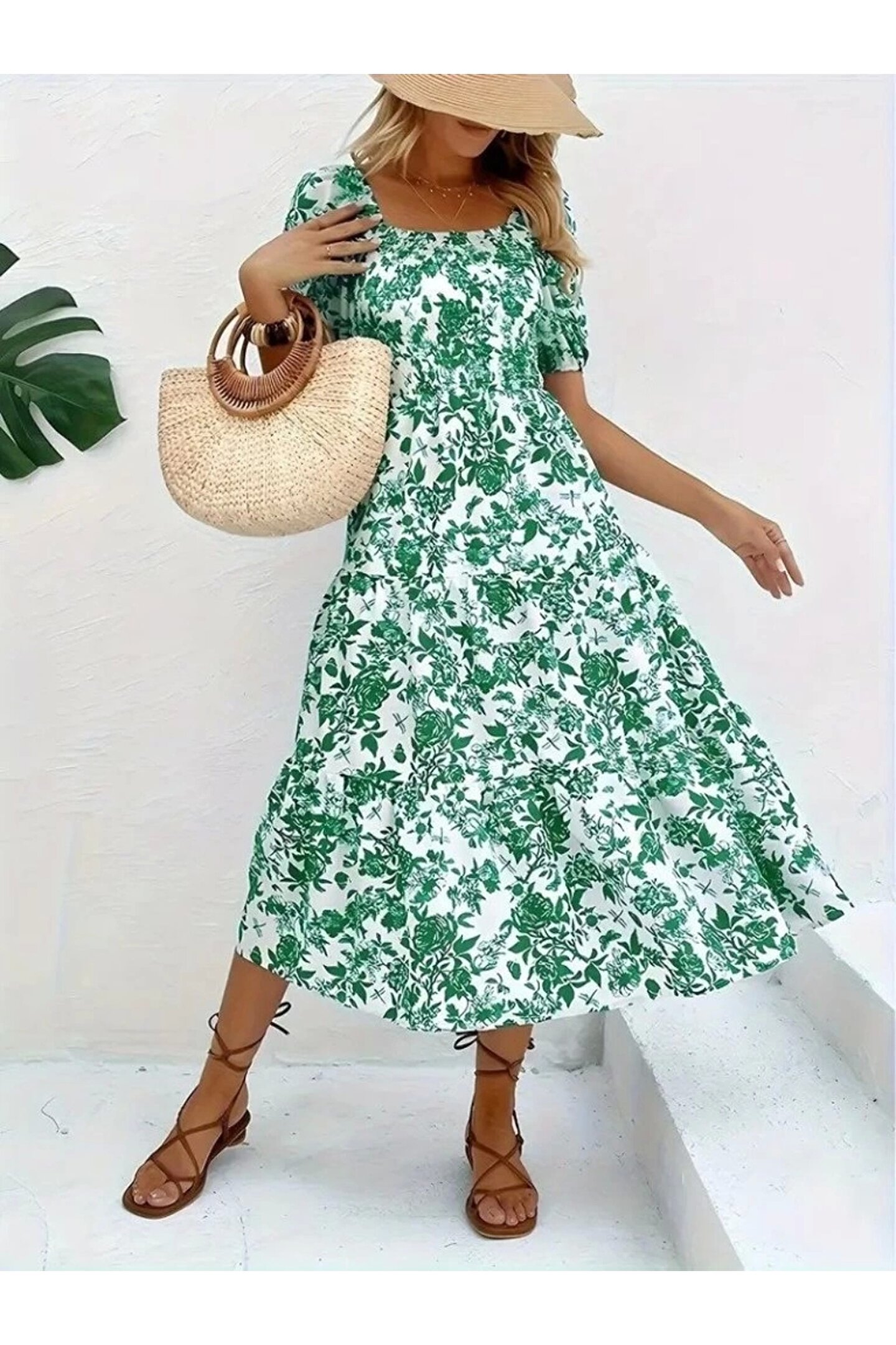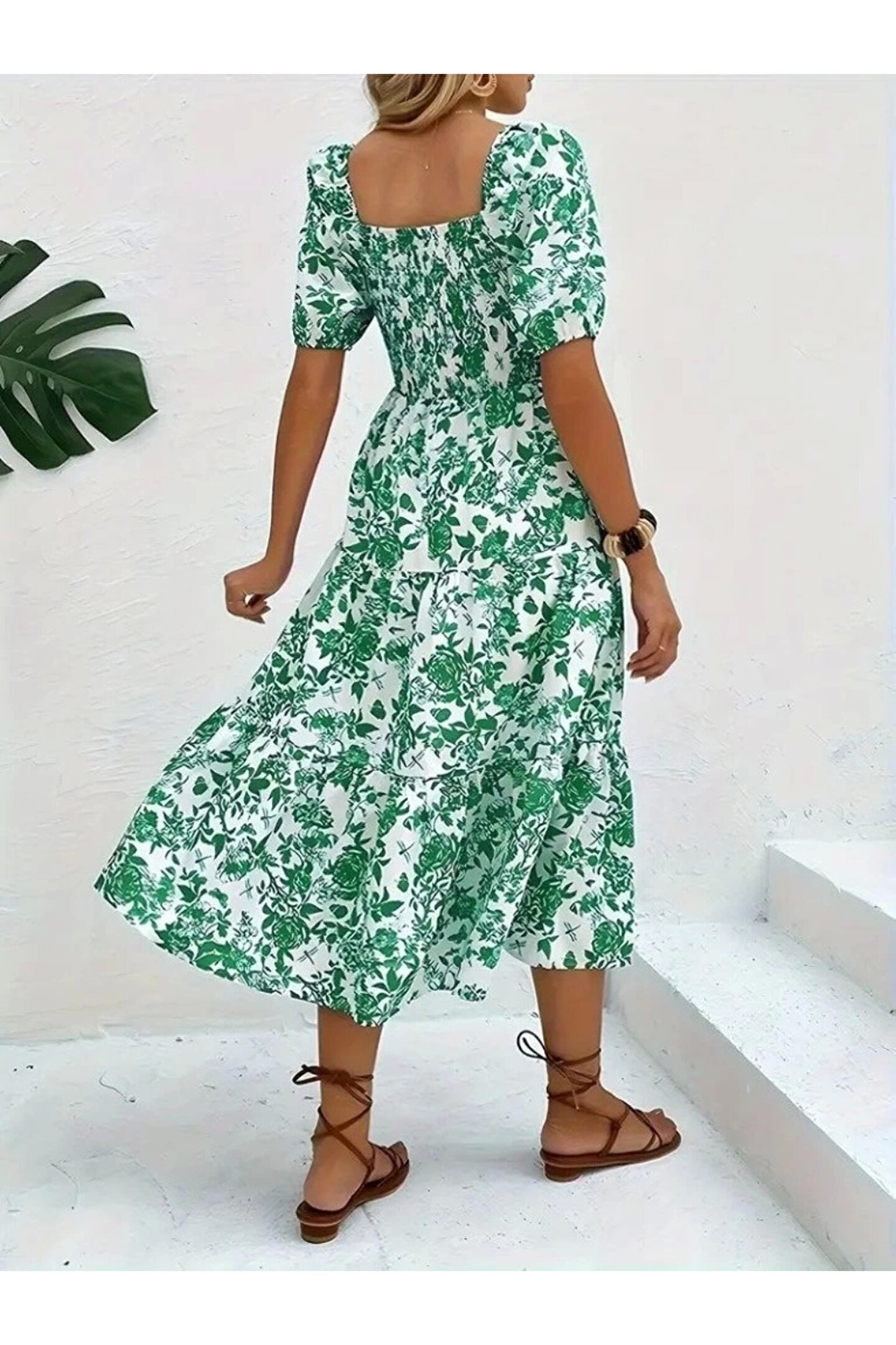 MOTTİSFASHİON Kadın Kısa Kollu Kare Yakalı Lastikli Desenli Süprem Elbise