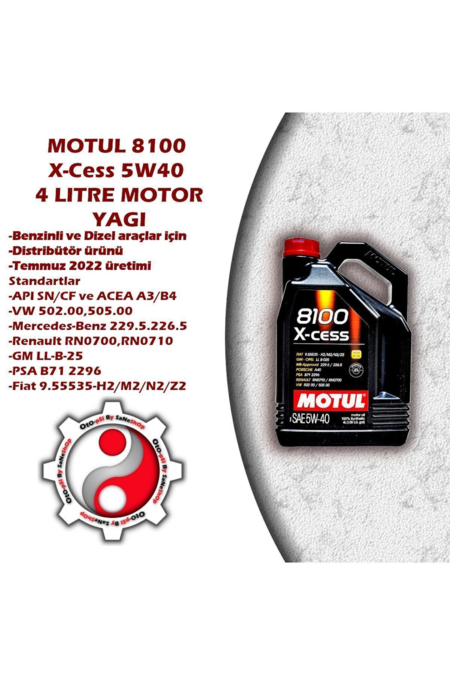 MOTUL X-CESS 5W40 4L (D.T. 2023) Motul 8100 X-Cess 5W40 4LT motor yağı, yüksek performanslı, sentetik bir motor yağıdır. Bu yağ, yüksek sıcaklıklar ve ağır kullanım koşullarına dayanabilen, yüksek mukavemetli bir formülasyona sahiptir. Aynı zamanda, bu yağ, çok yüksek sıcaklıklarda bile mükemmel bir koruma sağlar ve uzun motor ömrünü destekler. Bu yağ, benzinli ve dizel motorlar için uygundur ve önerilen değişim aralıklarına göre kullanılması önerilir. Ayrıca, bu yağ, yüksek performanslı otomobiller ve motorsporları için önerilen bir üründür. Motul 8100 X-Cess 5W40 4LT motor yağı, birçok uluslararası standartları karşılamaktadır. Örneğin, bu yağ: API SN/CF, ACEA A3/B4 gibi en yüksek performans seviyelerine sahiptir. ; VW 502.00/505.01, Renault RN0700/RN0710, BMW Longlife-01 gibi özel otomatik şanzıman ve dizel motorlar için önerilen standartları karşılar. ; Mercedes-Benz 229.1, 229.3, 229.5 gibi özel dizel motorlar için önerilen standartları karşılar. ; GM LL-A-025, GM LL-B-025 gibi özel benzinli motorlar için önerilen standartları karşılar. ; Ford WSS-M2C913-C gibi özel benzinli ve dizel motorlar için önerilen standartları karşılar. ; Bu standartlar, Motul 8100 X-Cess 5W40 4LT motor yağının yüksek performanslı ve yüksek kaliteli bir ürün olduğunu göstermektedir. Ayrıca, bu yağ, yüksek performanslı otomobiller ve motorsporları için önerilen bir ürün olduğu için, bu tarz araçlarda kullanılması önerilir. SAHTE YAĞLARDAN KORUNMAK İÇİN DİSTRİBÜTÖR ÇIKIŞLI ÜRÜNLERİ TERCİH EDİNİZ..