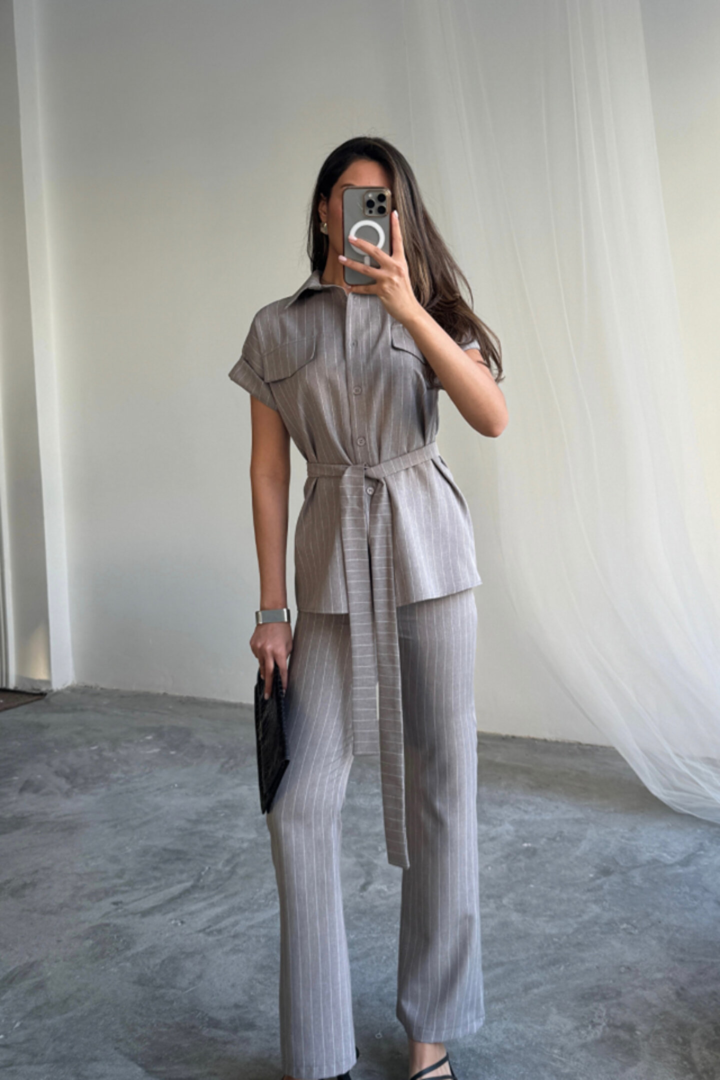 MRA Fashion ÇİZGİLİ POLYVİSKON BLUZ - PANTOLON TAKIM - Gri
