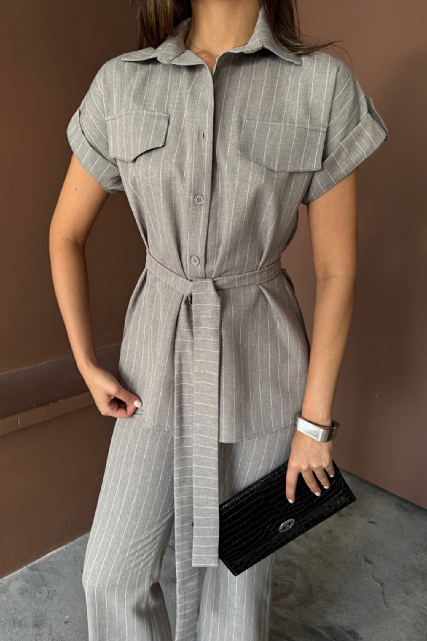 ÇİZGİLİ POLYVİSKON BLUZ - PANTOLON TAKIM - Gri