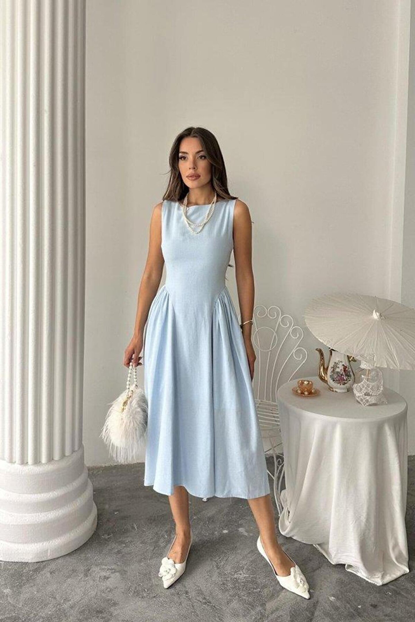 mrpurple Mavi Yanları Büzgülü Midi Boy Keten Elbise