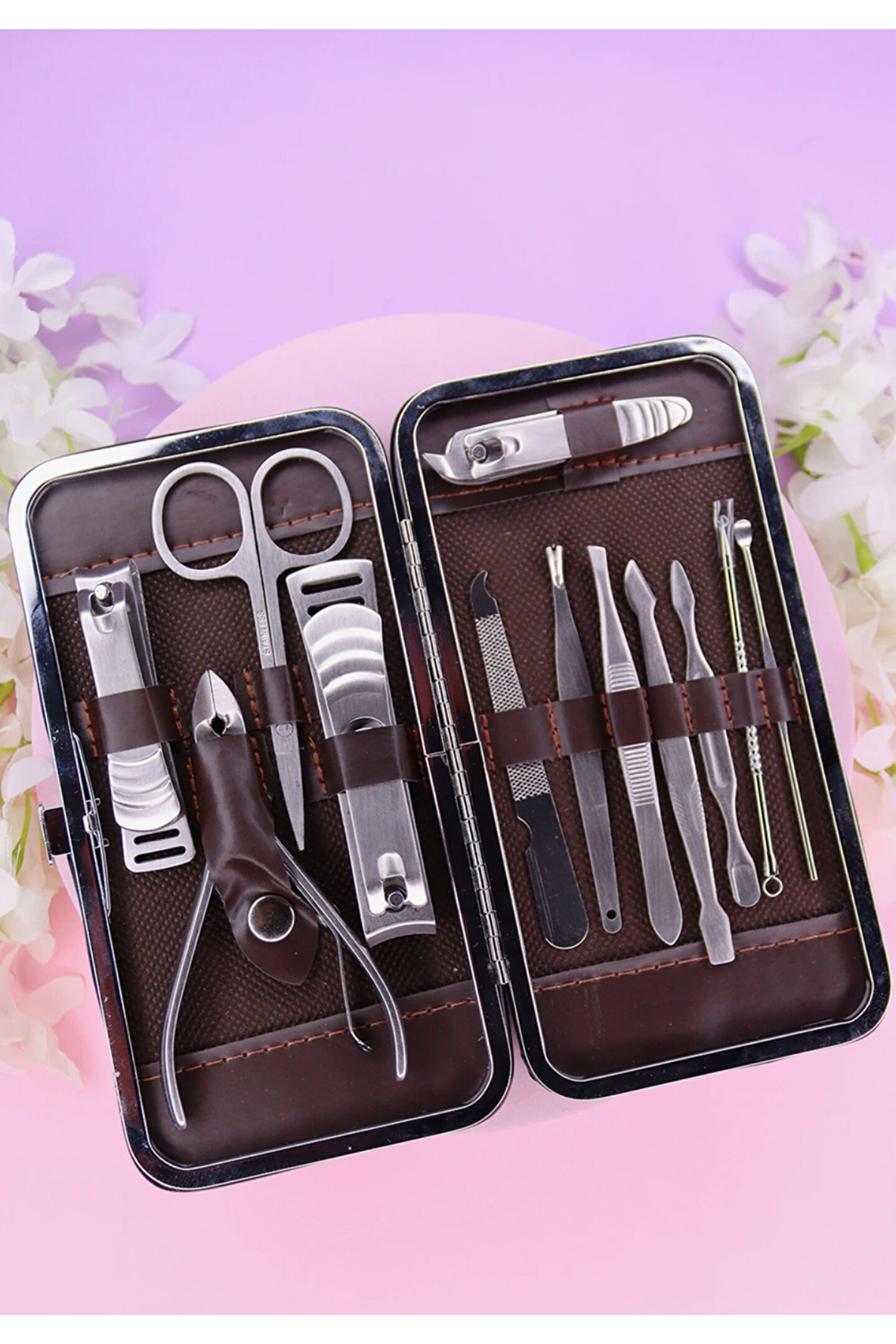16 Parça Profesyonel Çelik Paslanmaz Deri Çantalı Manikür Pedikür Tırnak Yüz Bakım Seti -pudra Pembe