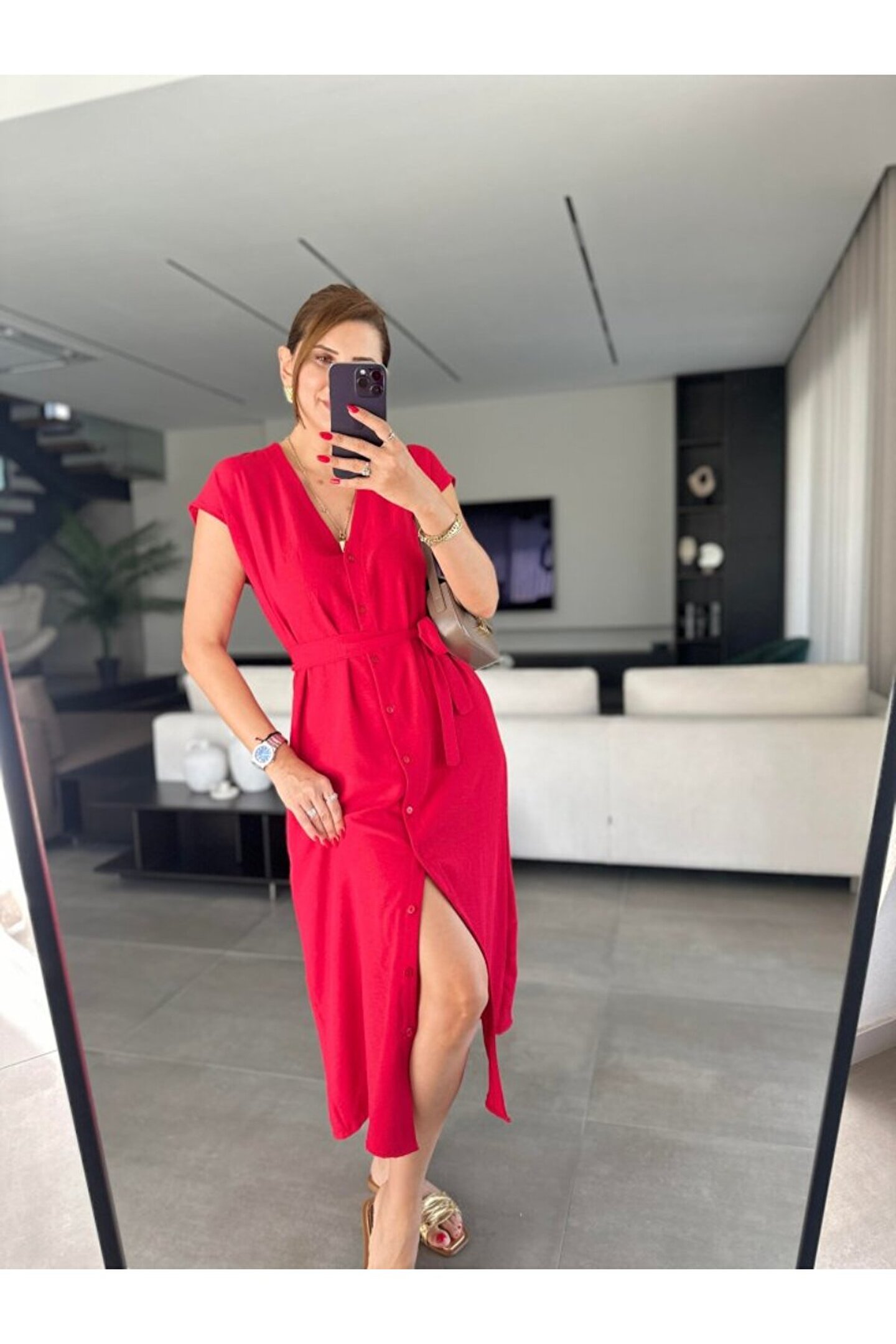 MUANA MOLINA EQURİ Kadınn V Yaka Düğme Detay Kuşak Dahil Elbise