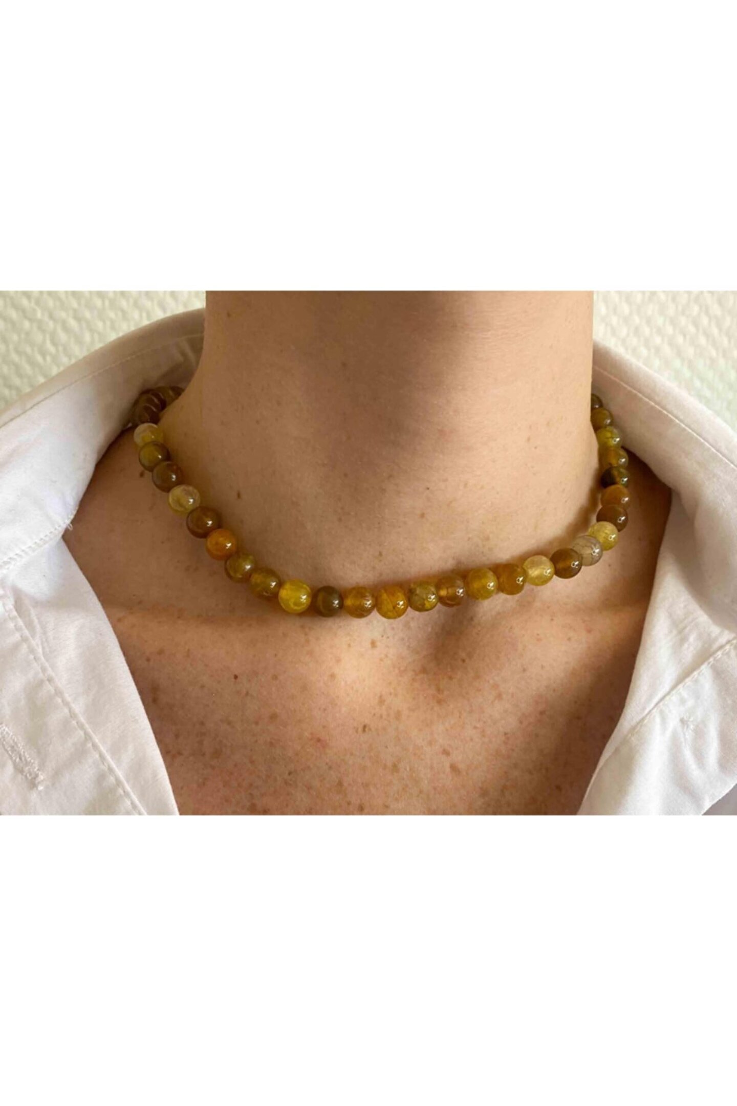 Doğal akik taşı kullanılarak üretilmiş, her bir kolye parçasında benzersiz desenler ve renk tonları bulunur; 8 mm boyutundaki bu kolyeler, zarif ve şık bir görünüm sunar; Doğal taş materyali sayesinde, her kolye el yapımı gibi hissettirir ve doğallığıyla dikkat çeker; Akik taşı, enerjiyi dengelemeye yardımcı olur ve duygusal dengeyi destekler;