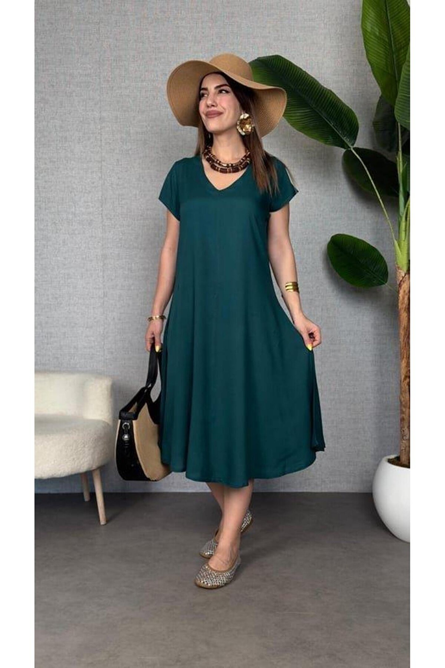 Kadın Kısa Kollu V Yaka Salaş Maxi Boy Elbise