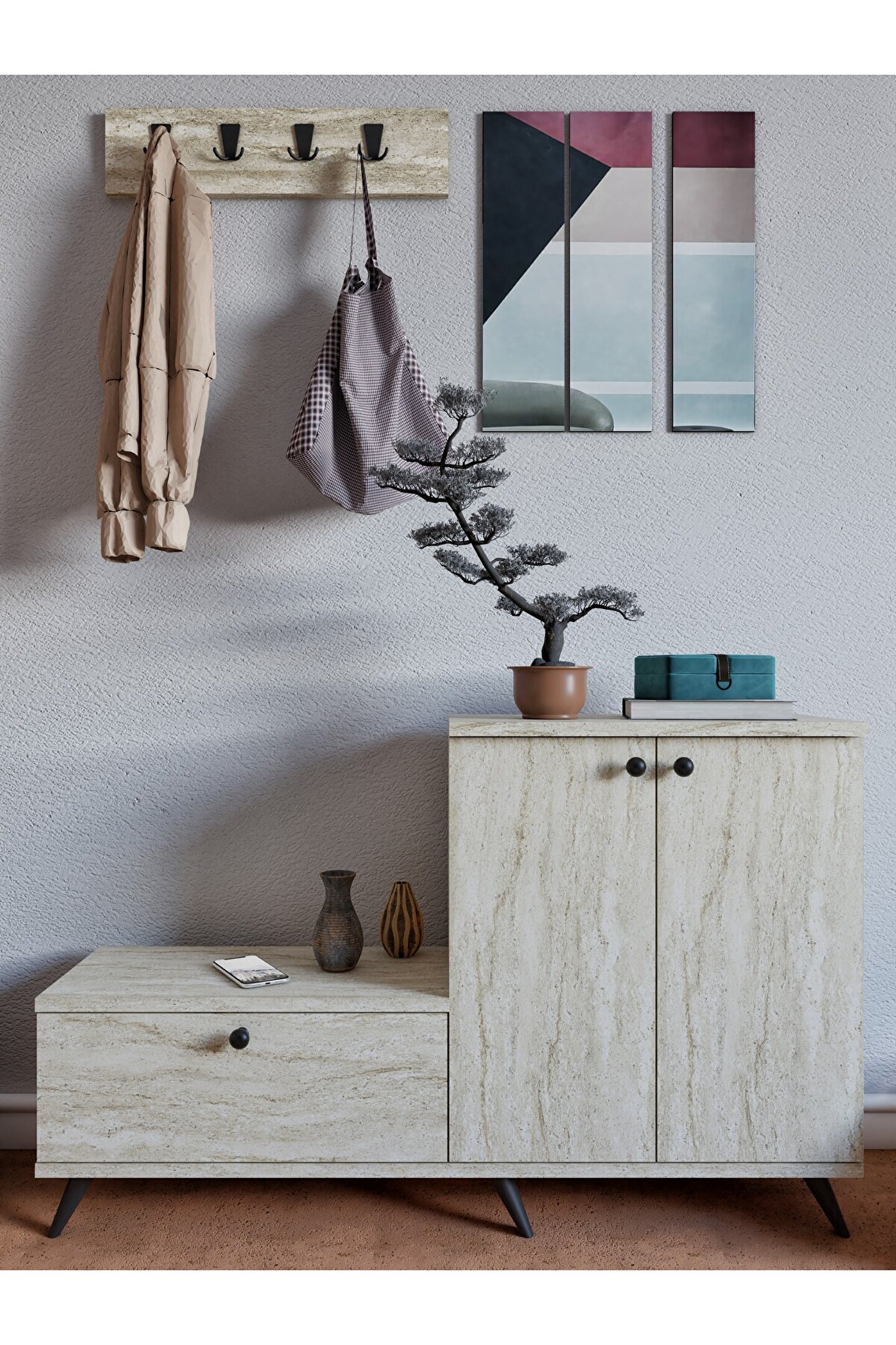 ayakkabılığın üst yüzeyi vazo, anahtarlık ya da çiçek gibi dekoratif objeler için ekstra bir alan olarak tercih edilebilir.