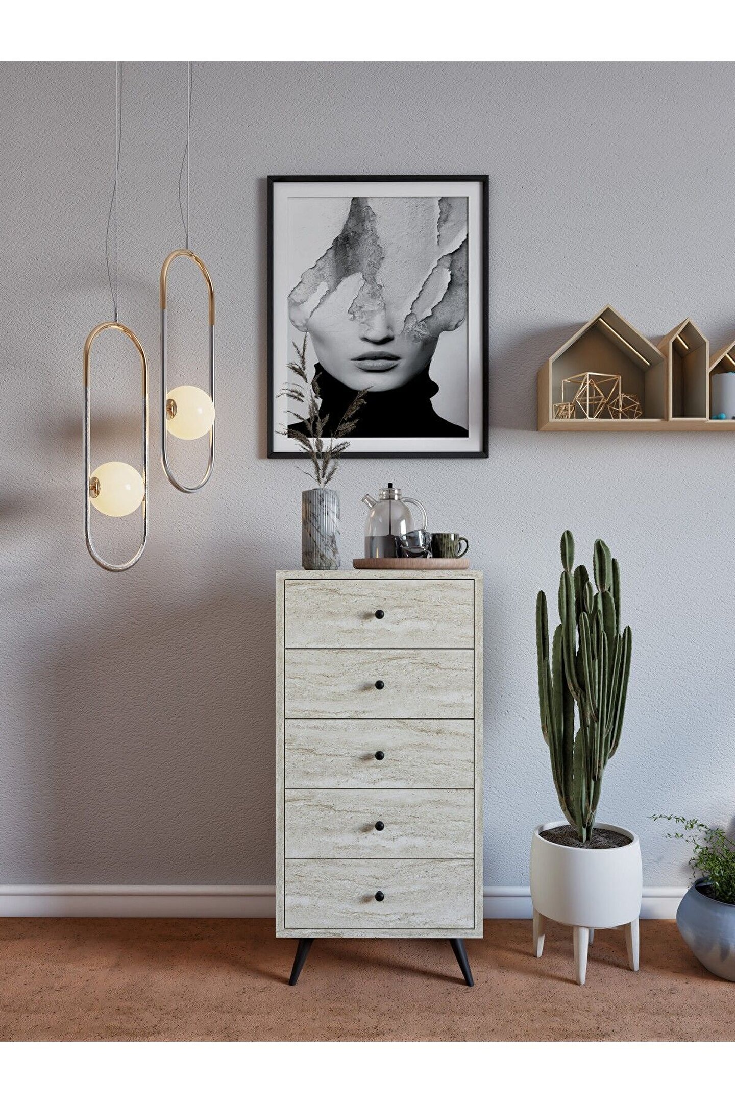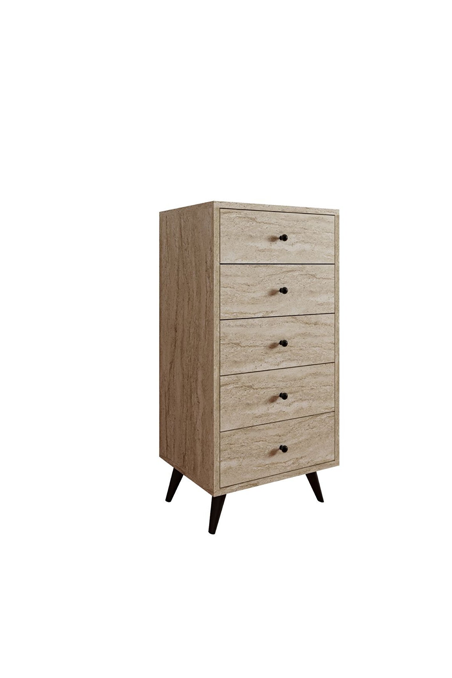 - Suntalam malzemesi sayesinde uzun ömürlü ve dayanıklı kullanım sunar; - Modern tasarımı, evinizin dekorasyonuna şık bir dokunuş katar; - Beş geniş çekmece kapasitesi, giysilerinizden aksesuarlarınıza kadar tüm eşyalarınız için bolca saklama alanı sunar; - Modern stil sahibi olan bu şifonyer, yaşam alanlarınıza çağdaş bir hava katmak için idealdir;