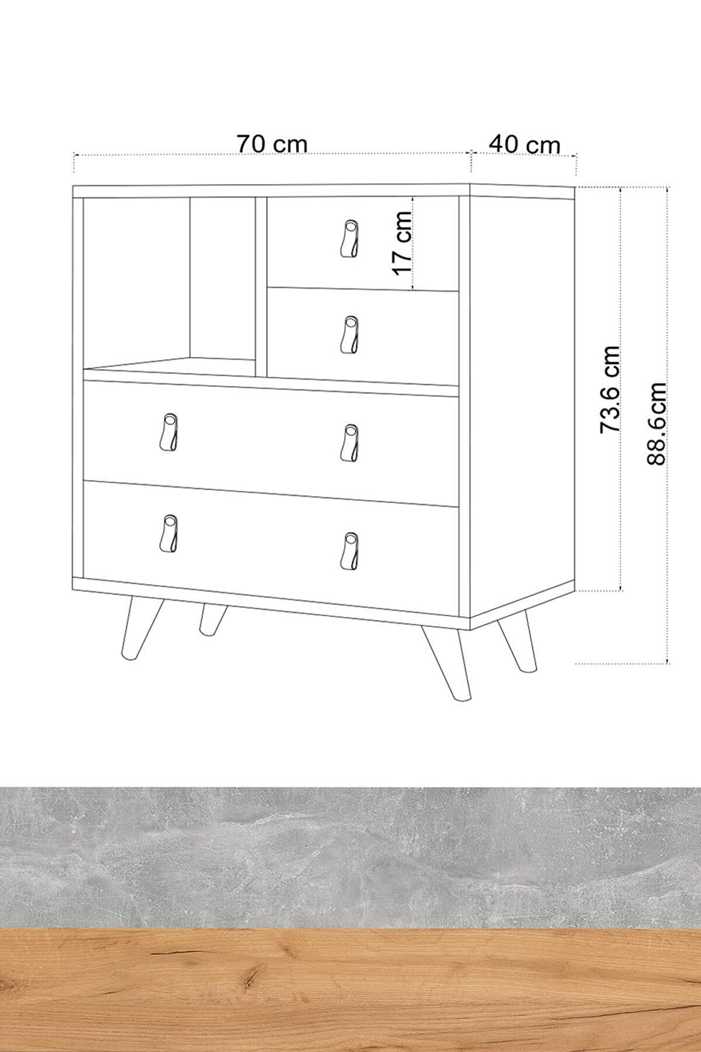 Ürün ölçüleri;g70 cm d40 cm y88.6 cm;g:Genişlik / d:Derinlik / y:Yükseklik;malzemeler;gövde: Gold oak(altın meşe) suntalam;kapak:Concrete (beton) suntalam Ayak:Cilalı ahşap ayak;kulp:Suni deri;renk;altın meşe-Beton gri;ürün özellikleri;kullanılan tüm malzemeler tse onaylı, e1 kalitesinde olup kanserojen madde içermez ve anti bakteriyeldir.;montajı kolaylaştıracak biçimde kurulum talimatı yer almaktadır. Ürün yüzeyinde bulunan ahşap doku, doğal ağacı aratmayacak görünümdedir. Beton desenli malzeme ile birleşerek ultra modern bir tasarım haline gelmiştir. Suni deri kulplar kullanılarak betong plus serisinin takıları tamamlanmıştır. Seriye ait diğer ürünleri kombin önerilerinde bulabilirsiniz.. Montaj;ürünlerimiz özel kargo paketinde demonte olarak teslim edilir. Paketlerde gerekli kurulum şeması, tüm vida ve aksesuarların montaj seması ile uyumlu malzeme torbası ve kullanma kılavuzu çıkmaktadır.