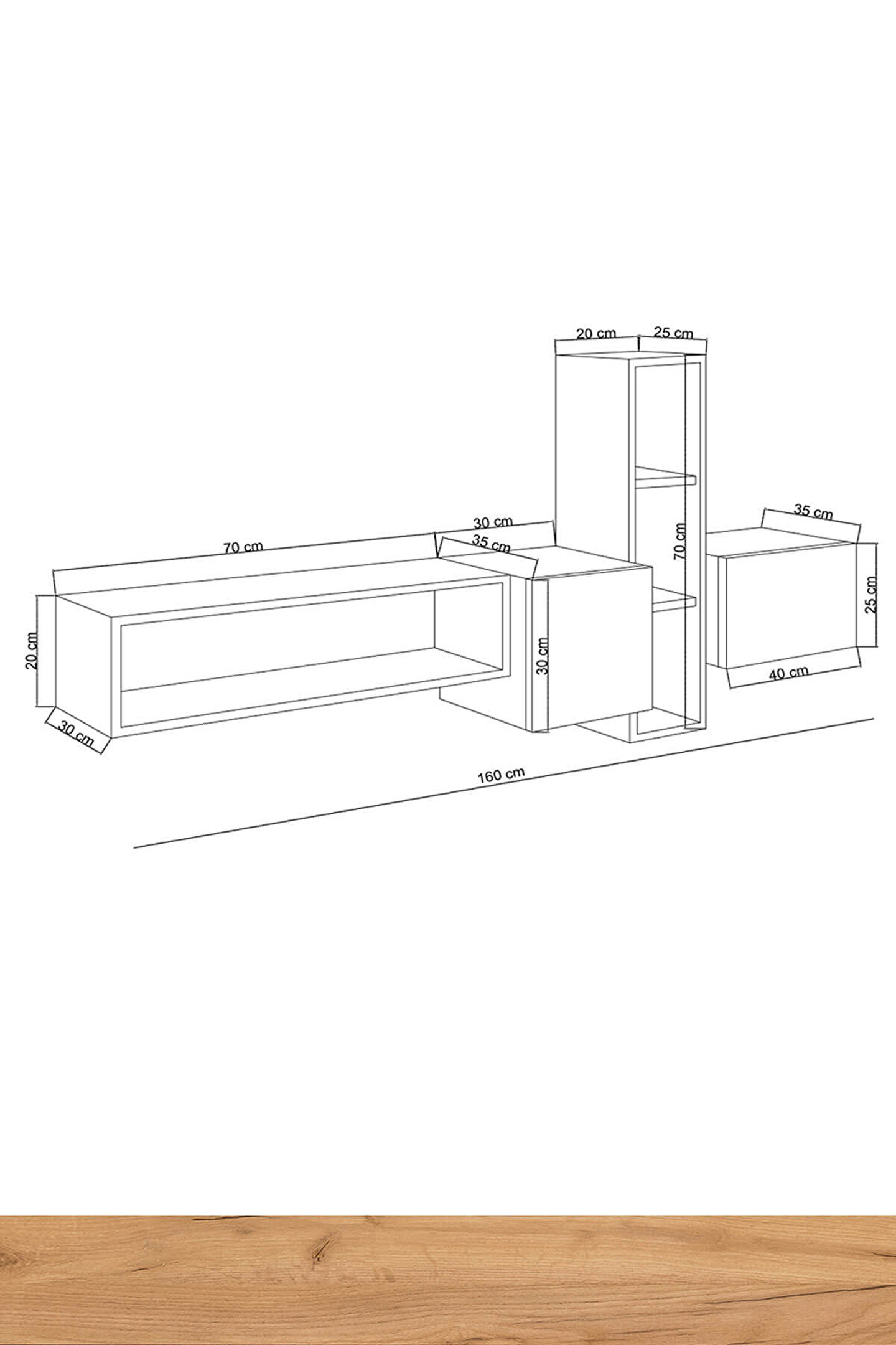 Ürün Ölçüleri;G160 cm D35 cm Y70 cm;G:Genişlik D:Derinlik Y:Yükseklik;Malzemeler;GÖVDE: ALTIN MEŞE SUNTALAM;KAPAK: BEYAZ SUNTALAM;Renk;BEYAZ /ALTIN MEŞE;Ürün Özellikleri;*Kullanılan Tüm Malzemeler TSE onaylı, E1 Kalitesinde olup Kanserojen madde içermez ve Anti Bakteriyeldir.;*Duvara montajlanarak kullanılmalıdır.;Ürün gövdesi 18 mm kalınlığında Parlak Beyaz/Altın Meşe renginde suntalam malzeme kullanılarak üretilmiştir. Ürün modüllerden oluşmaktadır ve dilediğiniz gibi modüllerin yerlerini değiştirebilirsiniz. Yaşam alanlarına modern çizgileriyle şıklık kazandırırken, kapalı ve açık bölmeleri ile depolama ihtiyacınızı giderebilecek niteliktedir.;Montaj;Ürünlerimiz özel kargo paketinde demonte olarak teslim edilir.;Paketlerde gerekli kurulum şeması, tüm vida ve aksesuarların montaj şeması ile uyumlu malzeme torbası ve kullanma kılavuzu çıkmaktadır.Kurulum müşteriye aittir.;Hızlı ve hatasız kurulum için montaj şeması bulunmaktadır.; Ürün kurulumunda profesyonel yardım alınmalıdır.;Ürün montajı tamamlandığında mutlaka duvara sabitlenmelidir.;Montaj İçin Gerekli Aletler;*Şarjlı Tornavida;*Çekiç;Değişim ve İade Koşulları;Ürünü kargodan teslim alınırken paketler mutlaka kontrol edilmeli, hasarlı paket veya ürünler teslim alınmamalı ve kargo yetkilisine hasar tespit tutanağı hazırlanması doğrultusunda yardım talep etmeniz gerekmektedir.;Çevreye ve sağlığa zararsız kanserojen madde içermeyen E1 kalite standardında malzeme kullanılmıştır.;Aksesuarlar;* Montaj: Ürün kurulu olmadan (demonte olarak) kutulu halde teslim edilmektedir.;* Kutu içinde tüm kurulum için gerekli olan malzeme çıkmaktadır (Bazı ürünlerin kurulumu için ek olarak tornavida, çekiç gerekebilir);* Ürün resimlerindeki aksesuarlar teşhir amaçlı olup, fiyata dahil değildir.