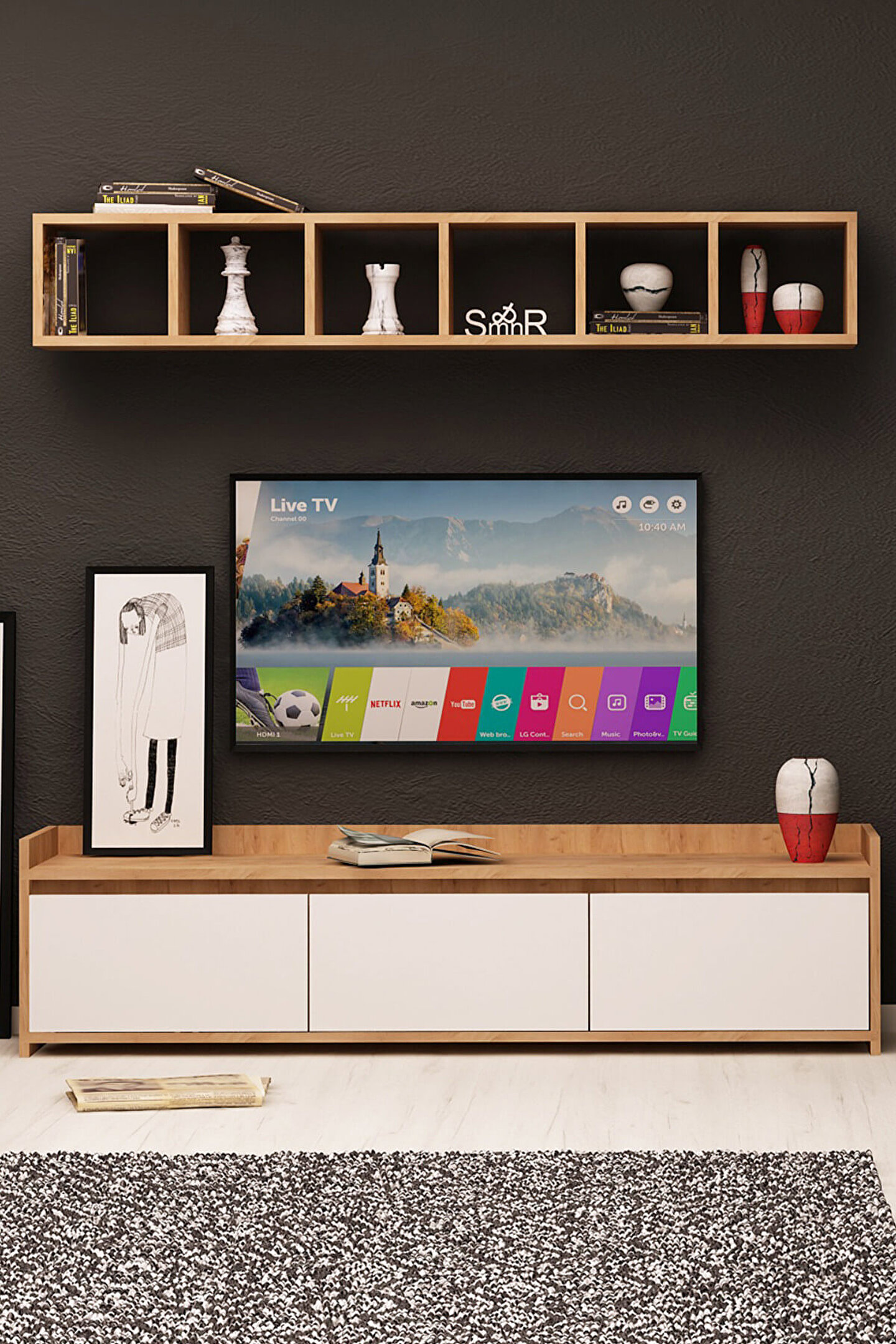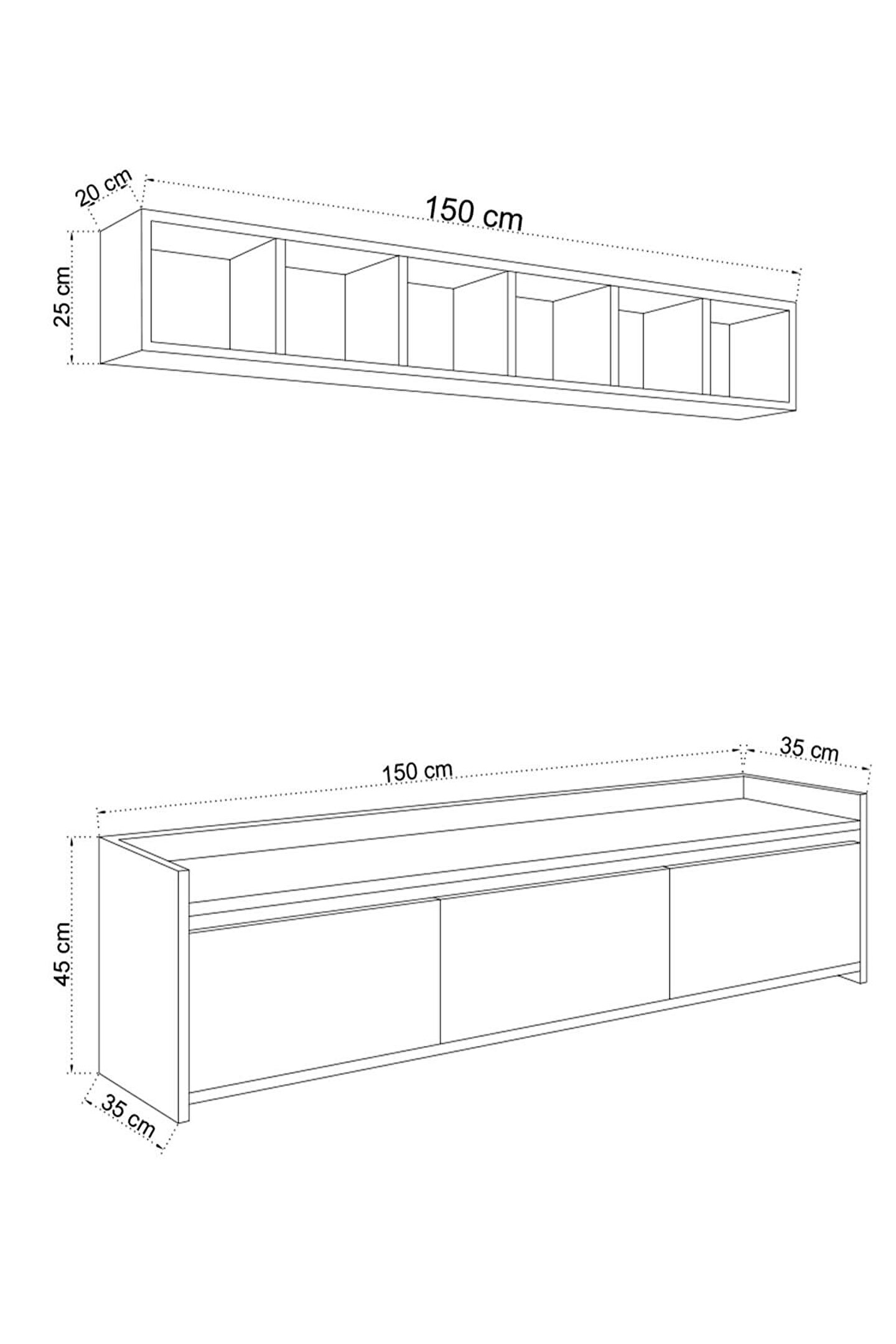 Ürün Ölçüleri;ALT MODÜL;G150 cm D35 cm Y45 cm;ÜST MODÜL;G150 cm D20 cm Y25 cm;G:Genişlik D:Derinlik Y:Yükseklik;Malzemeler;GÖVDE: ALTIN MEŞE SUNTALAM;KAPAK: BEYAZ SUNTALAM;Renk;BEYAZ /ALTIN MEŞE;Ürün Özellikleri;Kullanılan Tüm Malzemeler TSE onaylı, E1 Kalitesinde olup Kanserojen madde içermez ve Anti Bakteriyeldir.;Ürün gövdesi 18 mm kalınlığında Parlak Beyaz/Altın Meşe renginde suntalam malzeme kullanılarak üretilmiştir. Yaşam alanlarına modern çizgileriyle şıklık kazandırırken, kapalı ve açık bölmeleri ile depolama ihtiyacınızı giderebilecek niteliktedir.;Montaj;Ürünlerimiz özel kargo paketinde demonte olarak teslim edilir.;Paketlerde gerekli kurulum şeması, tüm vida ve aksesuarların montaj seması ile uyumlu malzeme torbası ve kullanma kılavuzu çıkmaktadır.;Kurulum müşteriye aittir.;Hızlı ve hatasız kurulum için montaj şeması bulunmaktadır.;Ürün kurulumunda profesyonel yardım alınmalıdır.;Ürün montajı tamamlandığında mutlaka duvara sabitlenmelidir.;Montaj İçin Gerekli Aletler;*Şarjlı Tornavida;*Çekiç;Değişim ve İade Koşulları;Ürünü kargodan teslim alınırken paketler mutlaka kontrol edilmeli, hasarlı paket veya ürünler teslim alınmamalı ve kargo yetkilisine hasar tespit tutanağı hazırlanması doğrultusunda yardım talep etmeniz gerekmektedir.;Çevreye ve sağlığa zararsız kanserojen madde içermeyen E1 kalite standardında malzeme kullanılmıştır.;Aksesuarlar;;* Montaj: Ürün kurulu olmadan (demonte olarak) kutulu halde teslim edilmektedir.;* Kutu içinde tüm kurulum için gerekli olan malzeme çıkmaktadır (Bazı ürünlerin kurulumu için ek olarak tornavida, çekiç gerekebilir);* Ürün resimlerindeki aksesuarlar teşhir amaçlı olup, fiyata dahil değildir.