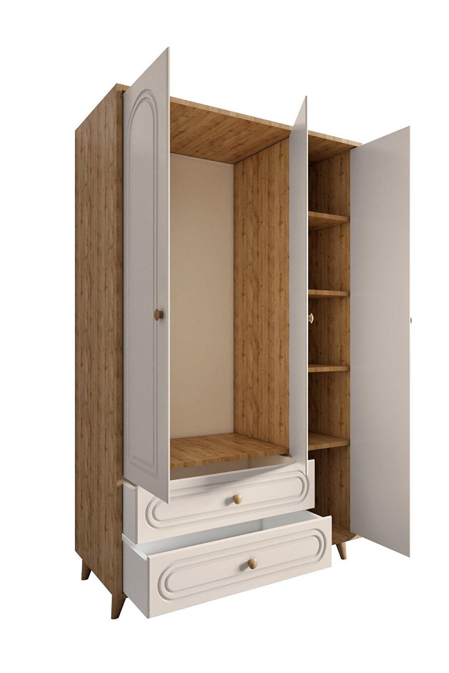 - Geniş iç hacmiyle Sofia Bohem gardrop, 49 cm derinliğindeki rafları sayesinde geniş eşya saklama alanı sunar.