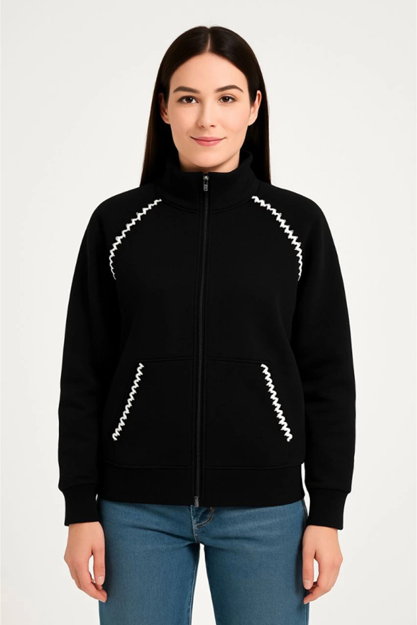 mzpkartan EQURİ Oversize Dik Yaka Fermuarlı Sweatshirt - Zincir Nakışli Kanguru Cepli, - Siyah