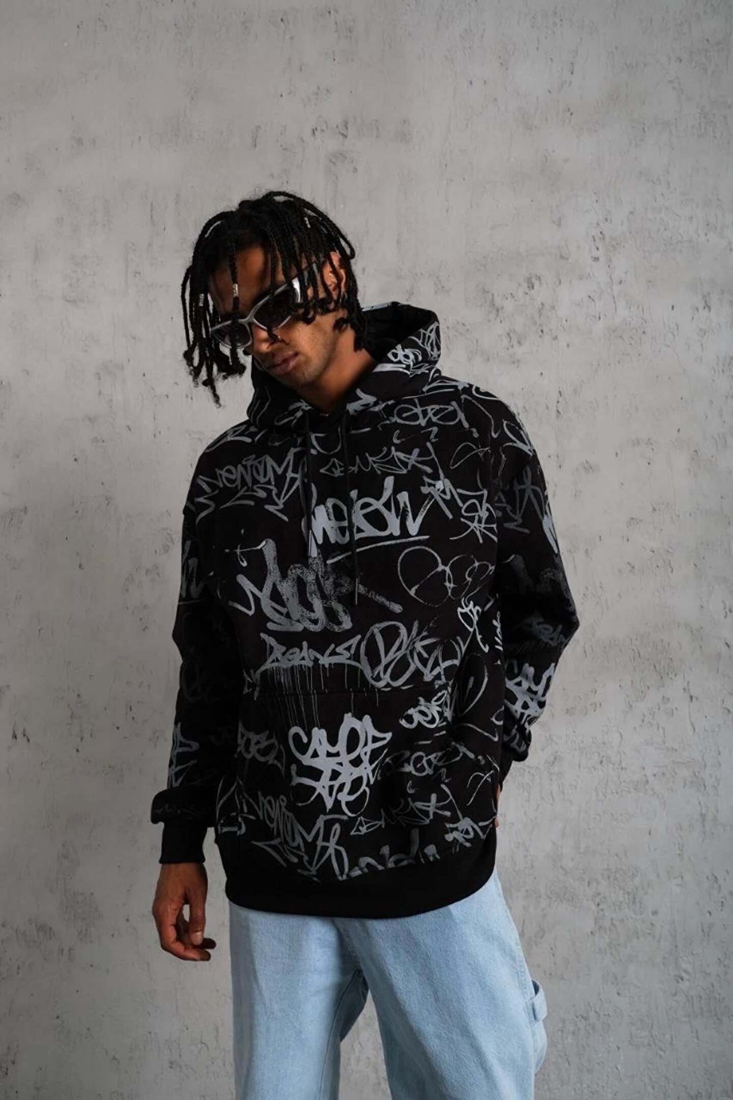 mzpkartan Erkek Baskılı Kapüşonlu Ribanalı Sweat - Siyah