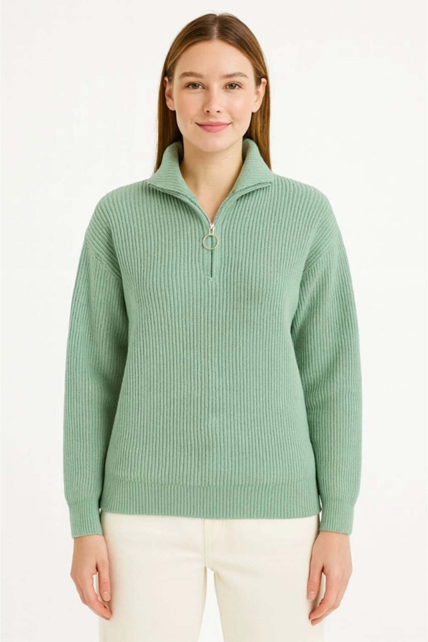 KADIN Yarım Fermuarlı Triko Kazak – Selanik Örgü, Dik Yaka, Pamuklu Dokuma, Oversize Uzun Kollu Kışlık Model - Mint Yeşili
