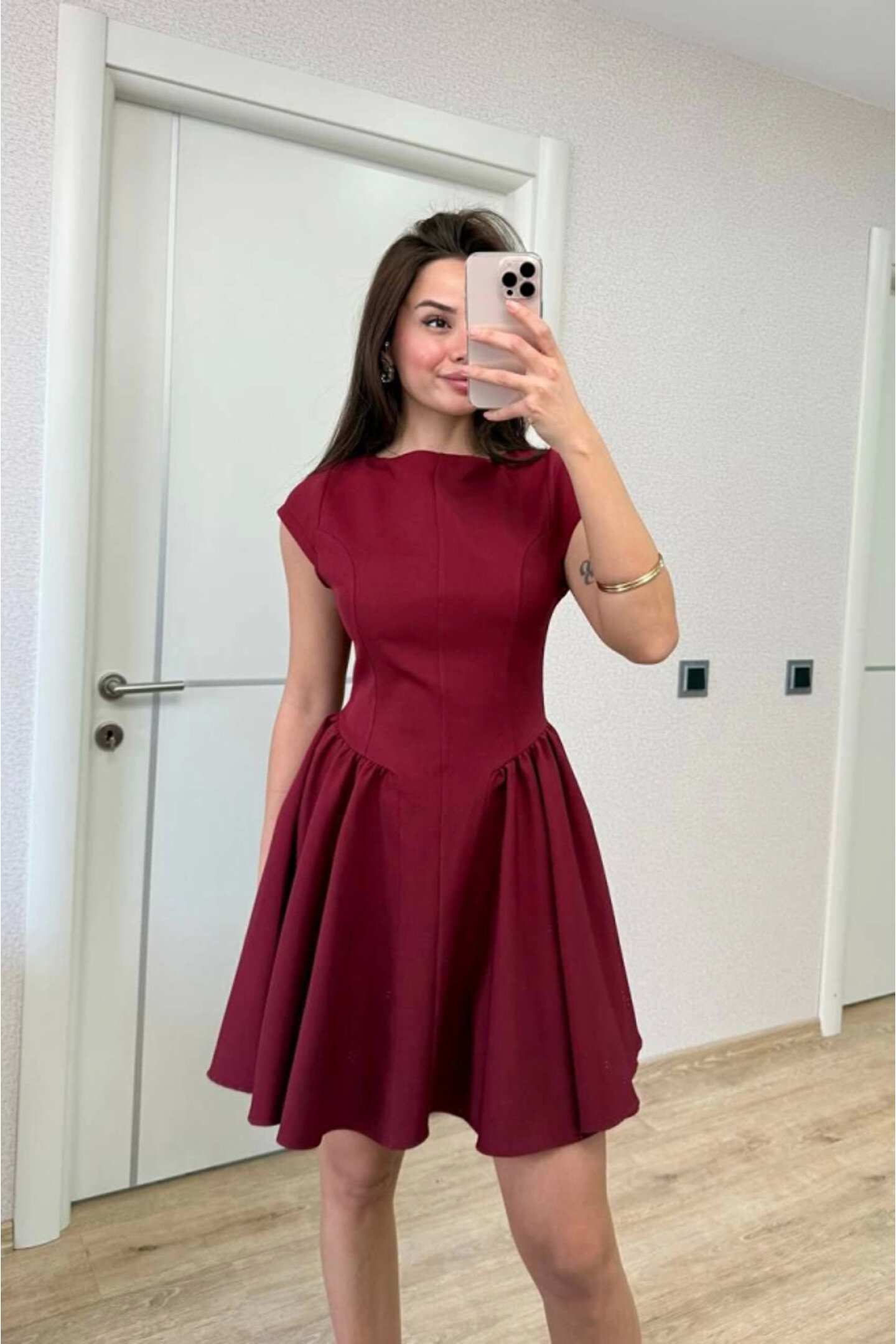 Sırt Dekolteli Çan Detaylı Mini Elbise - Bordo