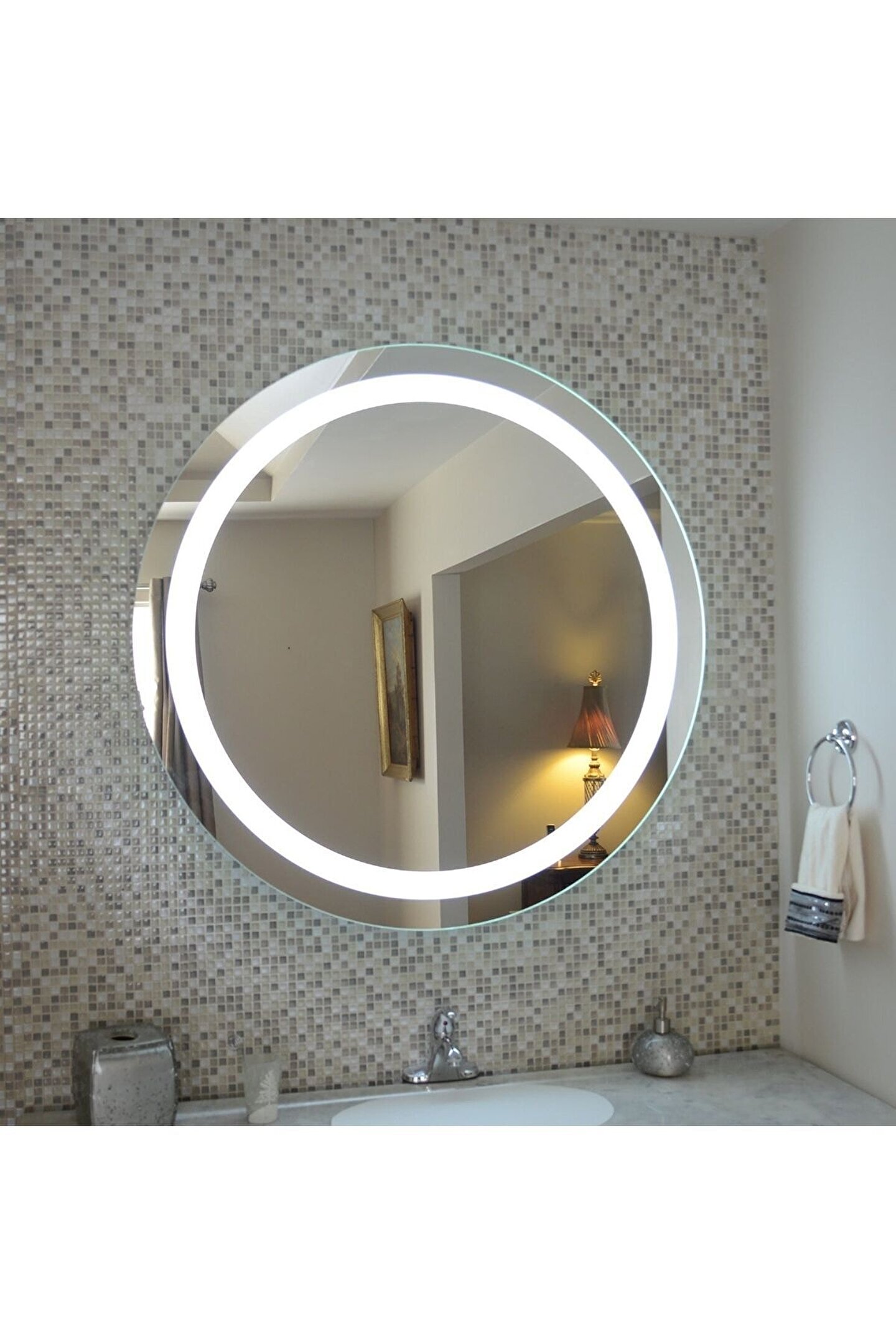 Narkissos Dizayn 70 cm Kumlamalı Beyaz Ledli Yuvarlak Banyo Aynası Makyaj Aynası Trafolu