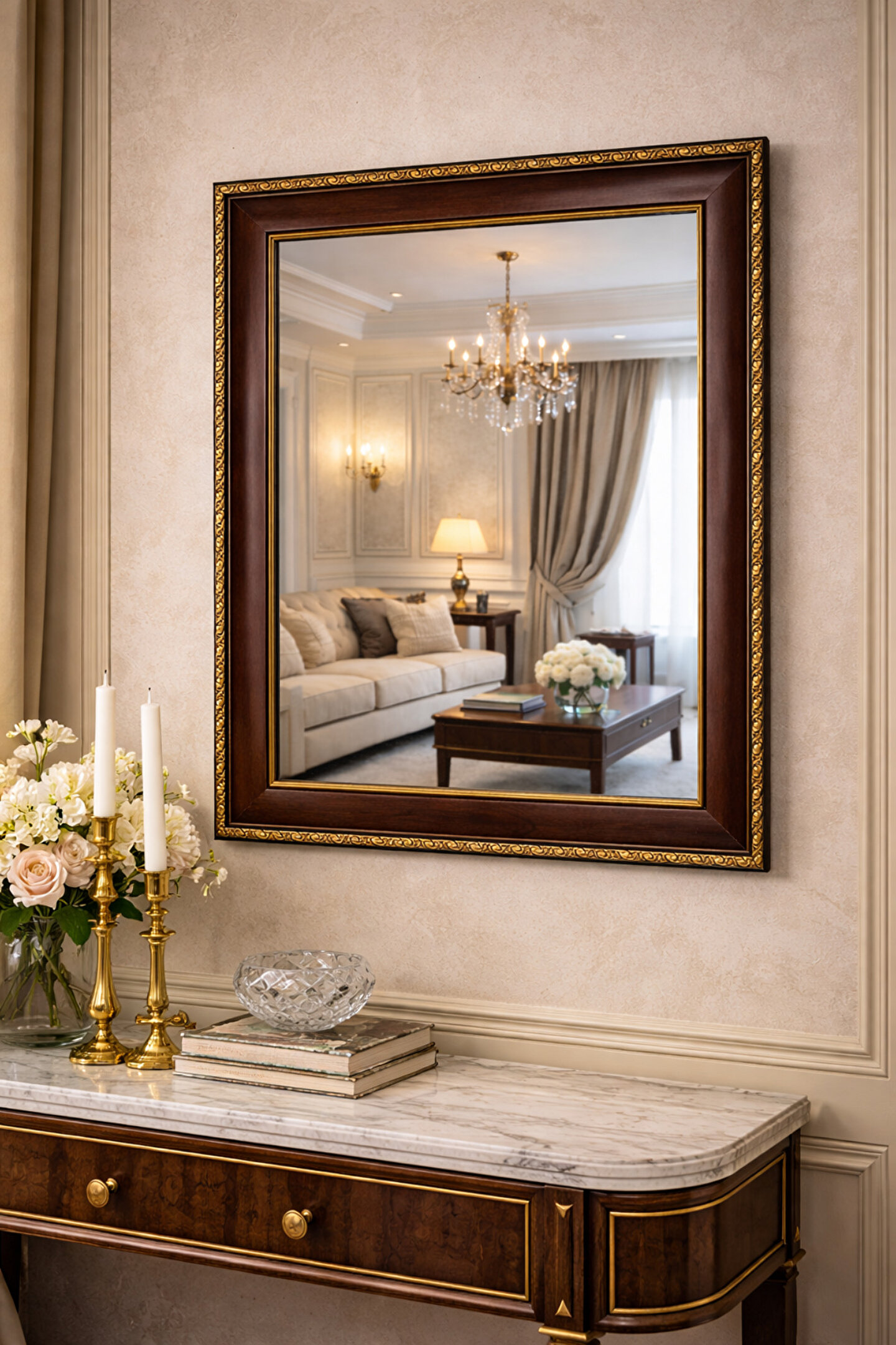 Narkissos Dizayn Kahverengi Ahşap Görünümlü Gold Altın Detaylı Çerçeveli Ayna 5cm Genişlikte Çerçeve-Klasik Lüx Ayna