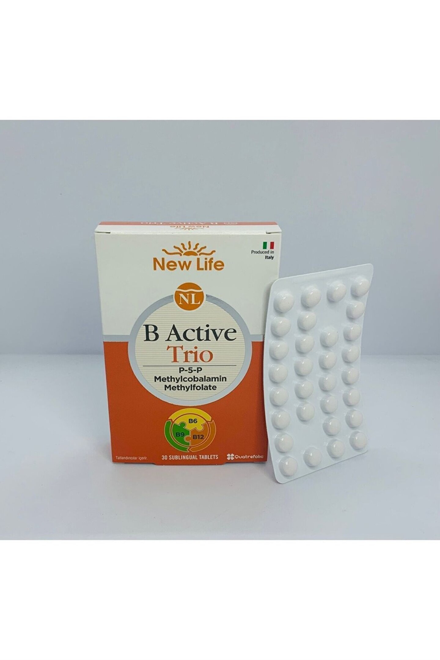 New Life B Active Trio 30 Dilaltı Tablet 3 Adet İçindekiler : Stabilizörier: Mannitol, polivinilpolipirolidon, ksilitol, emülgatör, mikrokristalin selüloz, piridoksal 5-fosfat (B6 vitamini), asitlik düzenleyici: kalsiyum fosfat, emülgatör, yağ asitlerinin mono- ve digliseritleri, aroma vericiler: vanilya aroması, vişne aroması, emülgat?r: yağ asitlerinin magnezyum tuzları, topaklanmayı önleyici: silikon dioksit, metilkobalamin (B12 vitamini), (6S)-5-metiltetrahidrofolik asit, glukozamin tuzu (folik asit) (Quatrefolic), tatlandırıcılar, sukraloz, steviol glikozitler, neohesperidin DC. ; Quatrefolic ((6S)-5-metiltetrahidrofolik asit, glukozamin tuzu) Gnosis S.p.A. ; Corporalion'ın tescilli markasıdır. ; Tavsiye Edilen Günlük Alım Dozu : Yetişkinler için tavsiye edilen günlük tüketim miktan 1 tablettir. ; Tabletleri yutmayınız. ; Dilaltında çözünmesini bekleyiniz. ; Uyarılar : Tavsiye edilen günlük porsiyonu aşmayınız. ; Takviye edici gıdalar normal beslenmenin yerine geçemez. ; Çocukların ulaşamayacağı yerde saklayınız. ; İlaç değildir. ; Hastalıkların önlenmesi veya tedavi edilmesi amacıyla kullanılmaz. ; Hamilelik ve emzirme dönemi ile hastalık veya ilaç kullanılması durumlarında doktorunuza danışınız. ; Aşın tüketimi laksatif etki yaratabilir. ; Gluten ve laktoz içermez. ; Vegan kullanıma uygundur. ; Menşel : Italya Gidanın Net Miktarı: 7,5 g (30 tablet);