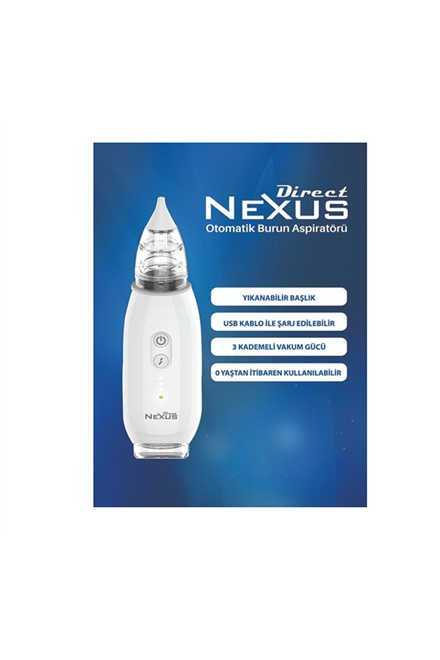Direct Nexus Elektrikli Burun ve Kulak Aspiratörü DİRECT NEXUS ELEKTRİKLİ BURUN VE KULAK ASPİRATÖRÜDİRECT NEXUS KALİTESİ VE DEVAMED GÜVENCESİ Ürün özellikleri; Yıkanabilir başlığı sayesinde yedek uç ihtiyacınız yok; Yeni doğandan itibaren tüm yaşlara uygundur; USB kablo ile şarz edilebilir; Her yerde, her ortam kolayca kullabailirsiniz; 3 kademeli vakum gücü sayesinde her yaşa uygun; Herhangi bir yardımcı alet/aperat gerektirmez; Kulak temizeleme başlığı sayesinde bebeğinizin kulağını temizleyebilirsiniz; Akıllı şarz göstergesi;
