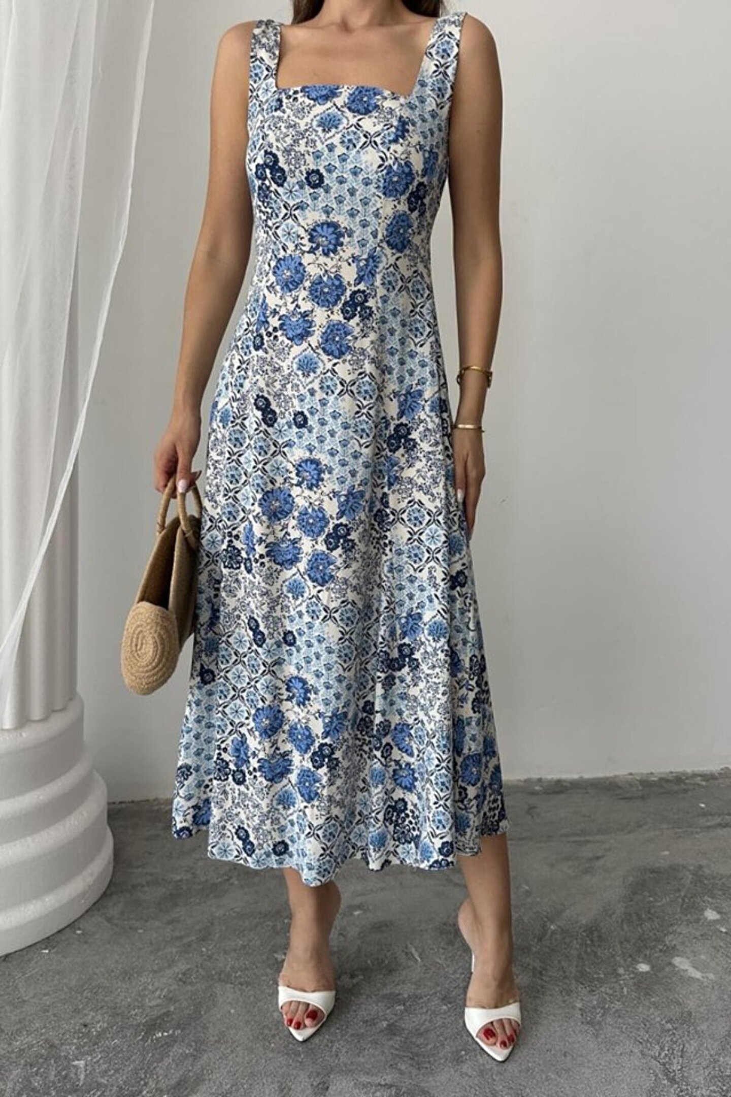 NİDAM BUTİK EQURİ Mavi Çiçekli Viskon Elbise