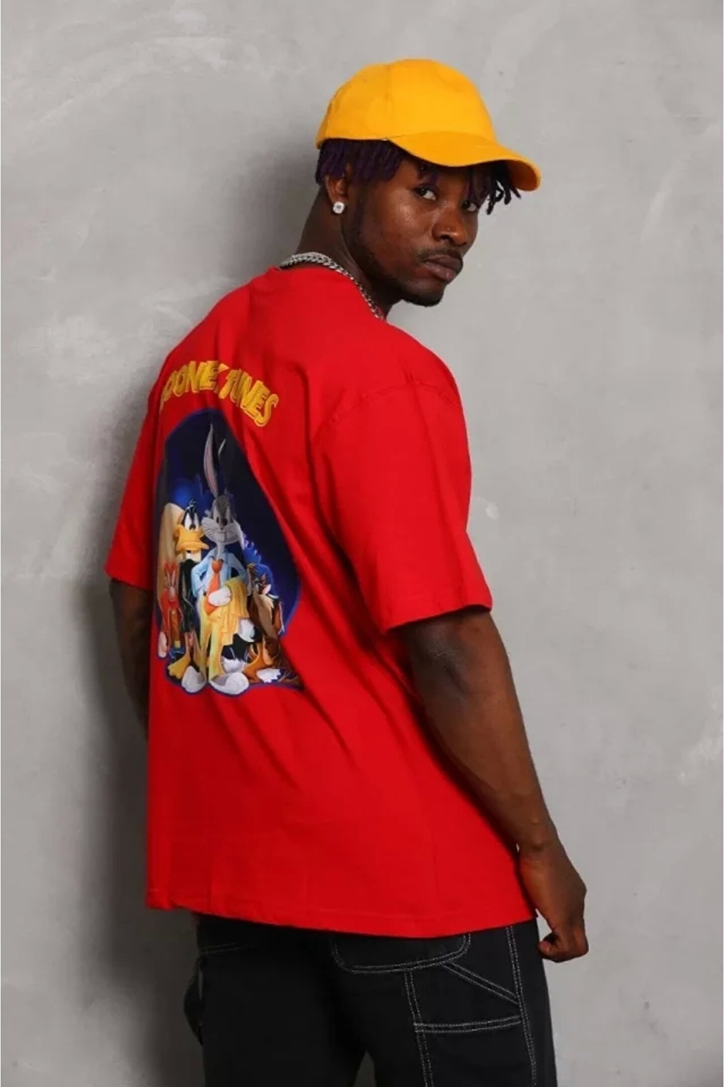 Unisex Oversize Baskılı Bisiklet Yaka T-Shirt - Kırmızı