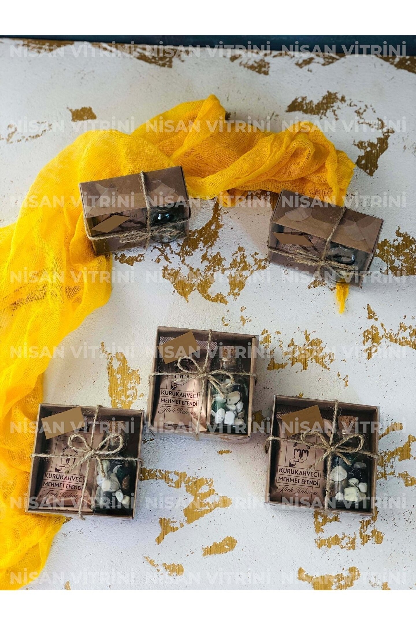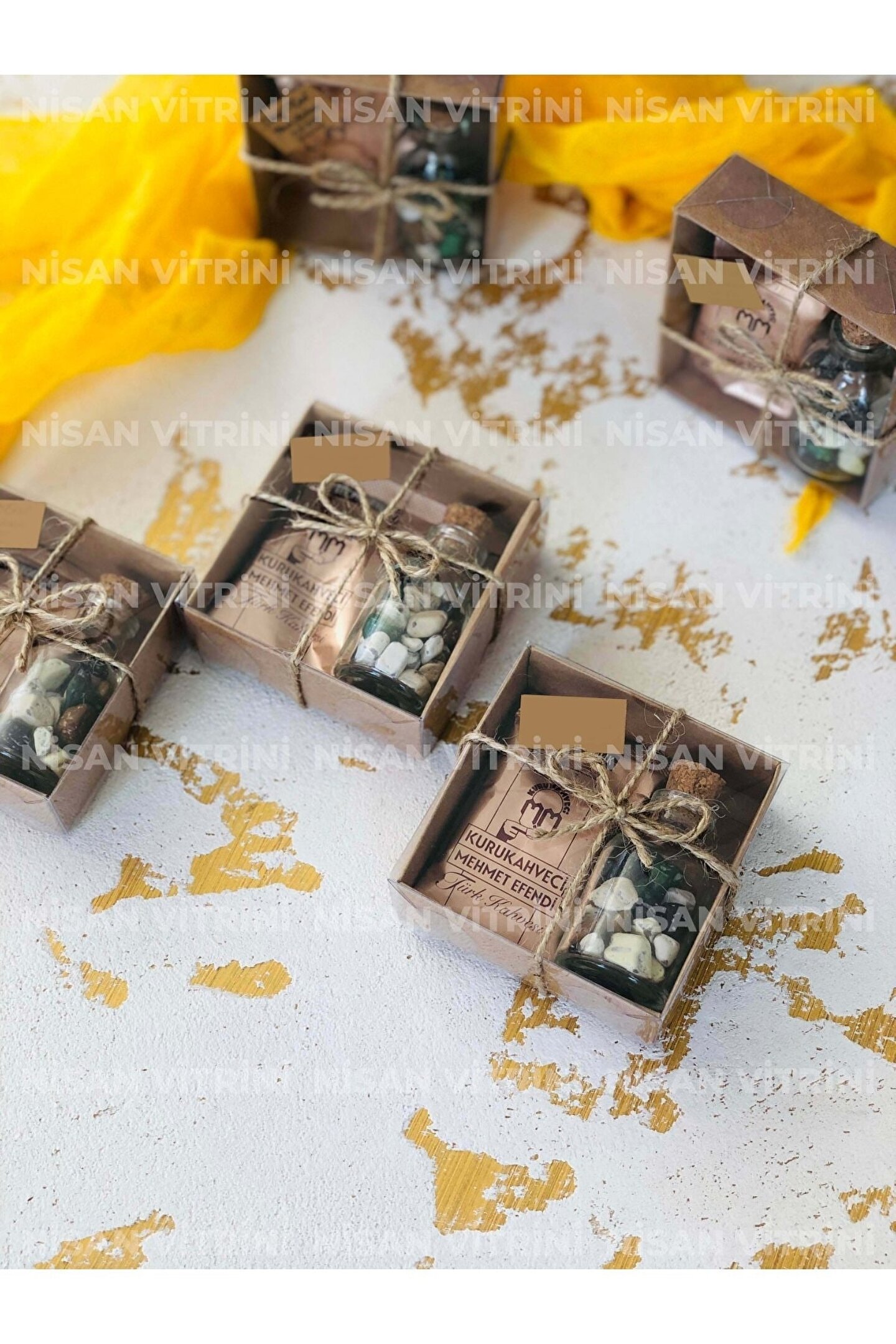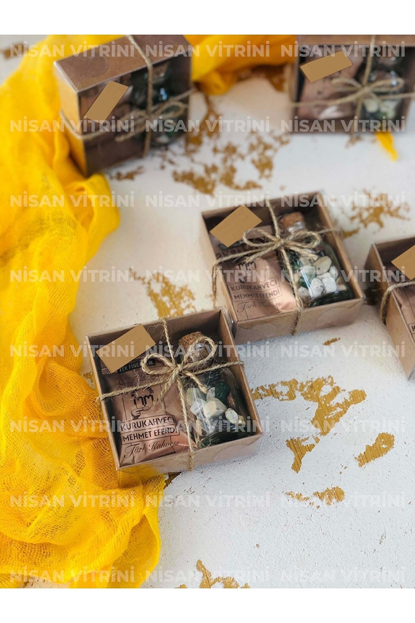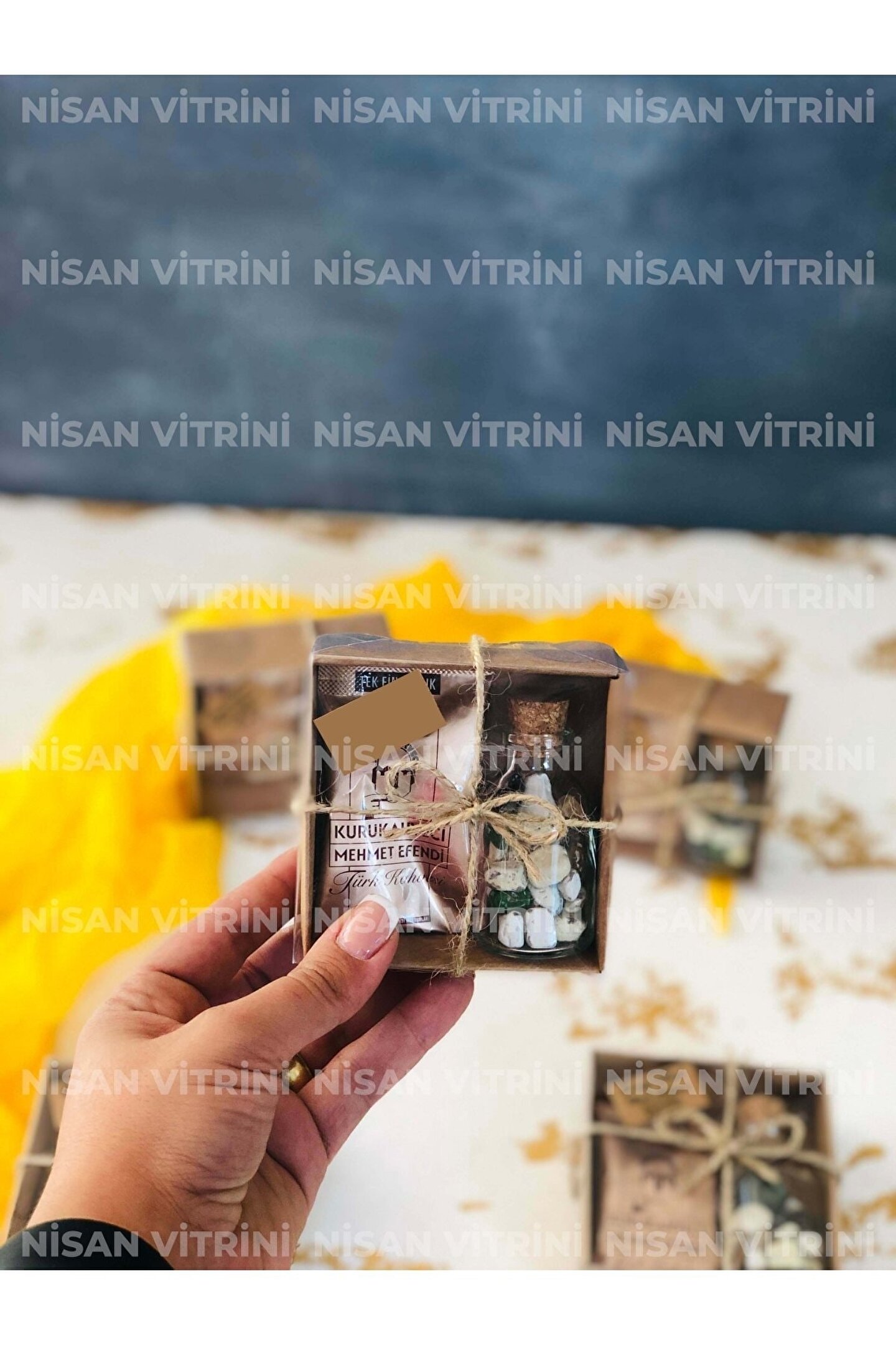 Kraft kutu içerisinde 1 adet 6gr Mehmet Efendi Türk Kahvesi, 1 adet 25cc çakıl taşı çikolata şişesi bulunmaktadır. ; Ürün Nisan Vitrini Ürünüdür. ; Kutunun dış kısmı jüt ip kurdelelidir. ; Ürün fotoğrafta görüldüğü gibi süslenmiş olarak gönderilmektedir. ; Kutu boyutu 8 x 8 x 3 cmdir. ; Verilen toplam fiyat 10 adet içindir. ;