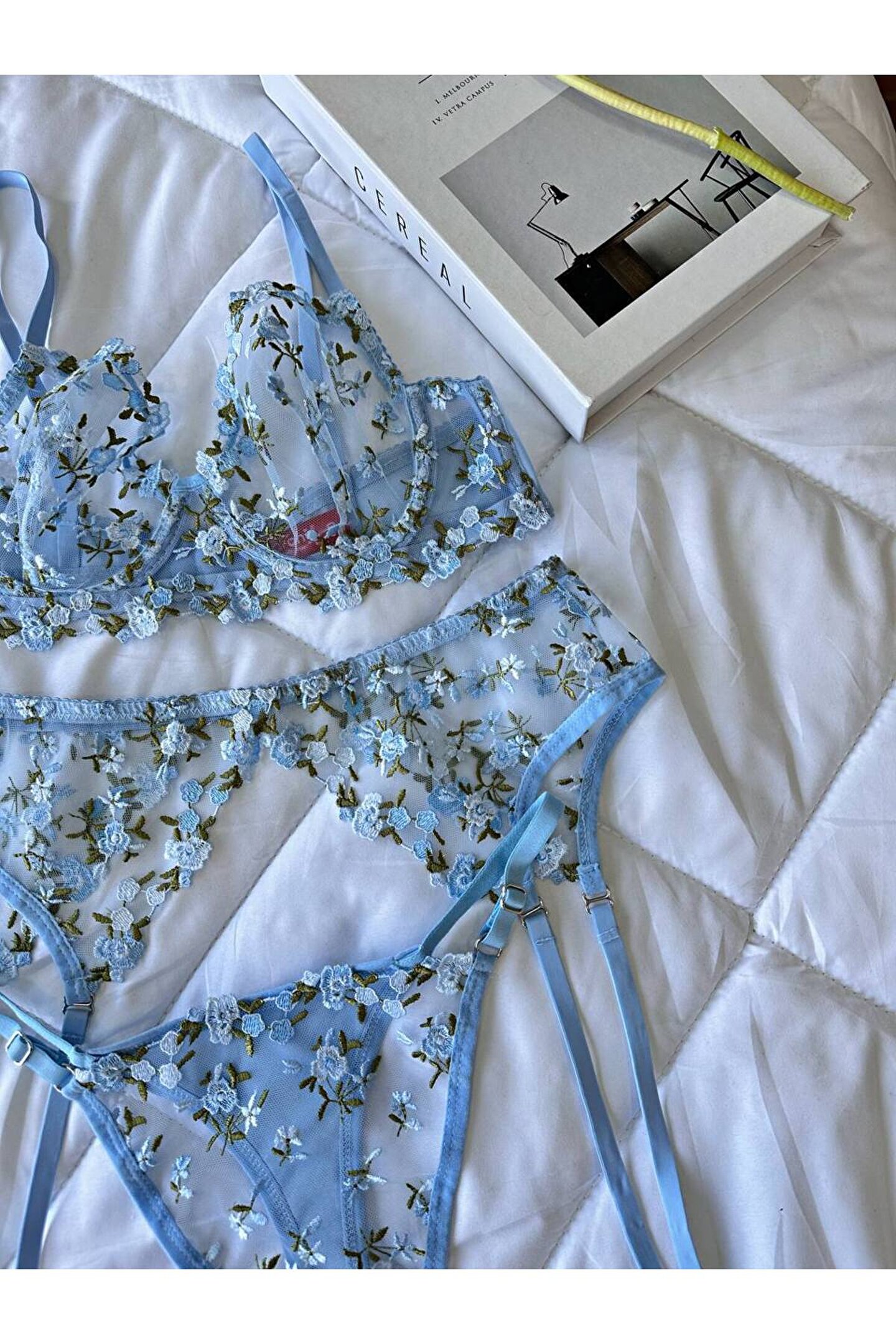 Zarafetin en romantik hâlini taşıyan üçlü jartiyer setimiz, ince işçiliği ve çiçek nakışlı tül detaylarıyla gardırobunuzun en özel parçalarından biri olmaya aday.