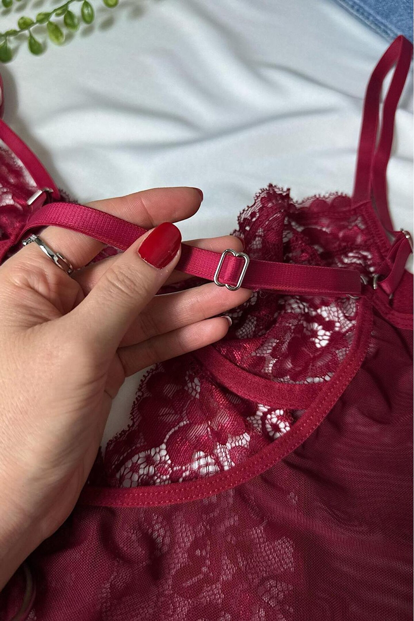 - Zarif dantel detayları ile süslenmiş, bordo renkteki bu transparan bodysuit, özel anlarınızda şıklığınızı tamamlar.; - 30 derecede elde yıkama imkanı sunarak kolay bakım avantajı sağlar; böylece zamandan tasarruf ederken ürününüzü koruyabilirsiniz.; - Sürdürülebilir malzemeler kullanılarak üretilmiş olup, çevreye duyarlı tercihler yapmanızı destekler.; - Kolsuz tasarımı sayesinde rahat hareket etme özgürlüğü sunarken, balenli yapısıyla mükemmel destek sağlar.; - İpliği boyalı kumaşı ile canlı ve parlak görünüm kazandırırken, dantel dokusuyla feminen çizgileri ön plana çıkarır.; - Bralette üst siluetiyle modern ve sofistike bir tarz sunarken, desenli tasarım göz alıcı detaylar ekler.; - Tanga alt silueti ile minimalizmi benimseyerek konforlu bir kullanım deneyimi yaşatır.; - Tek parça halinde gelen bu bodysuit, hem gündüz hem de gece kombinlerinizde ideal bir seçimdir.; - Homewear koleksiyonunun parçası olarak ev ortamında da şıklığından ödün vermeyen kadınların tercihi olur.; - Yetişkin yaş grubuna hitap eden bu ürün, her yaştan kadının gardrobunda yerini almayı hak ediyor.; - Balenli kalıbıyla vücut hatlarınıza uyum sağlayarak zarif bir duruş sergiler.; - Poliamid karışımlı materyali sayesinde dayanıklılık ve esneklik sunarken cildinizle dost dokunuşlar hissettirir.