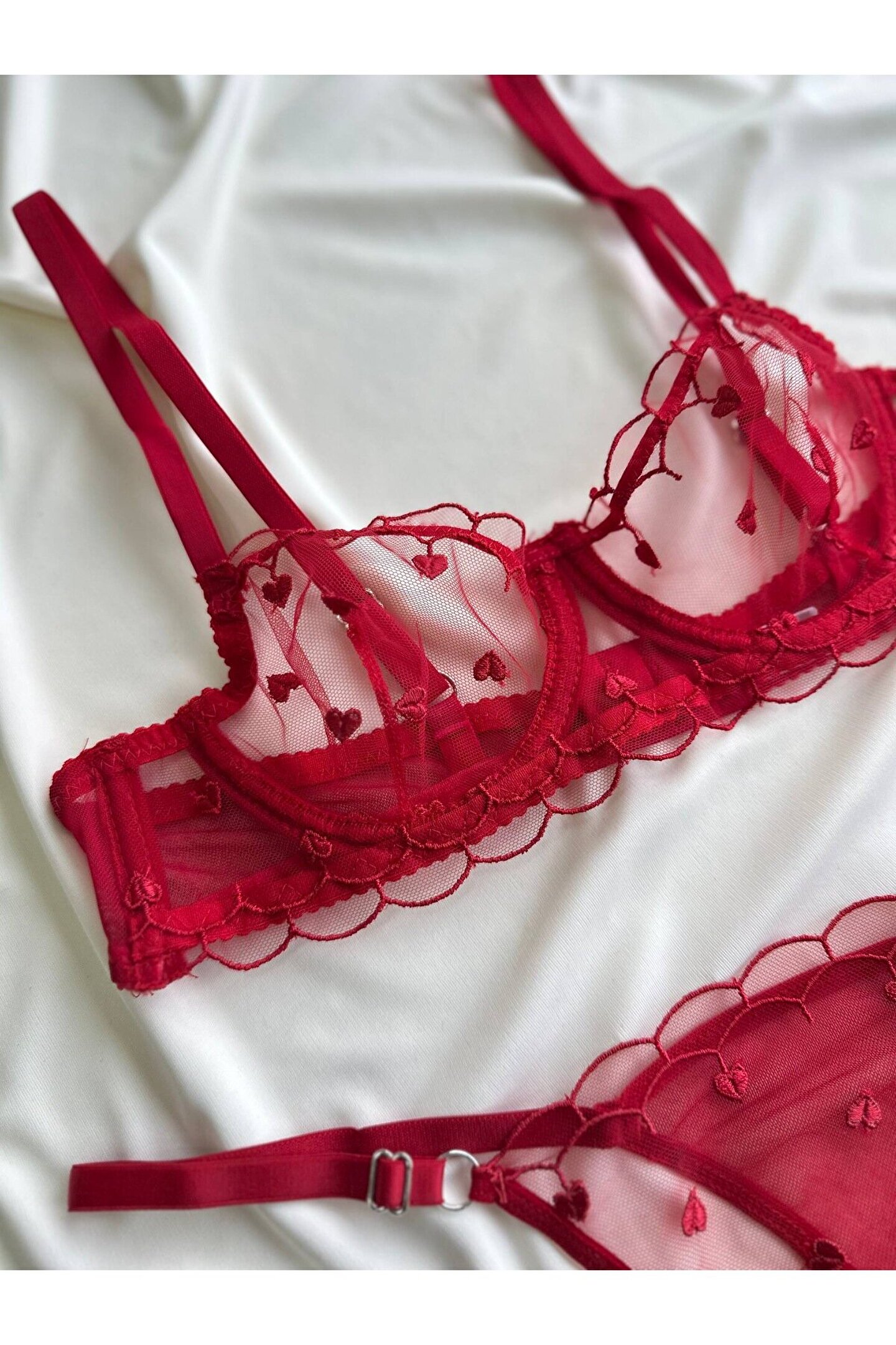 Kırmızı kalp nakış detaylarıyla süslenen bu iç giyim seti, romantik ve modern stilin zarif bir yansımasıdır.; Feminen çizgileri ön plana çıkaran tasarımıyla göz alıcı bir görünüm sunar.; ; Kapsız bralet formu, göğüsleri doğal şekilde sararak gün boyu rahatlık sağlar.; ; Hafif tül ve mesh dokuma kumaşı sayesinde nefes alabilen bir yapı sunar ve her mevsim konforlu kullanım imkânı verir.; ; Sütyen ve tanga olmak üzere 2 parçadan oluşan set, bütüncül ve şık bir iç giyim alternatifi sunar.; ; Normal bel kesimli tanga alt parçası hareket özgürlüğünü desteklerken, esnek bel detayı vücuda uyumlu bir duruş sağlar.; ; Balenli yapısı formu nazikçe şekillendirir.; ; 30 derecede yıkanabilir olması günlük kullanımda kolaylık sağlar.; ; Ürün Detayları: ; • Kırmızı kalp nakışlı özel tasarım ; • Kapsız bralet form – doğal duruş ; • Tül & mesh, hafif ve nefes alabilen kumaş ; • 2’li set: Sütyen + Tanga ; • Normal bel, esnek yapı ;