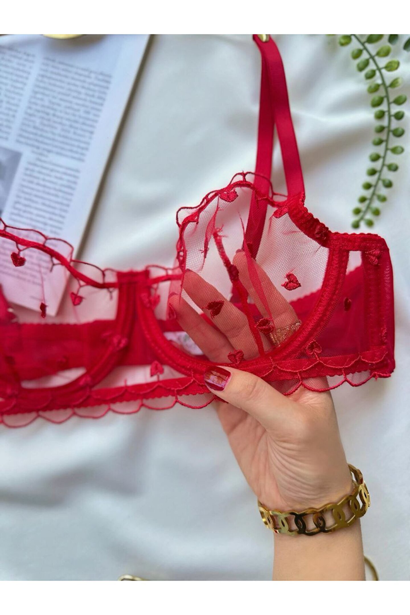 Kırmızı kalp nakış detaylarıyla süslenen bu iç giyim seti, romantik ve modern stilin zarif bir yansımasıdır.; Feminen çizgileri ön plana çıkaran tasarımıyla göz alıcı bir görünüm sunar.; ; Kapsız bralet formu, göğüsleri doğal şekilde sararak gün boyu rahatlık sağlar.; ; Hafif tül ve mesh dokuma kumaşı sayesinde nefes alabilen bir yapı sunar ve her mevsim konforlu kullanım imkânı verir.; ; Sütyen ve tanga olmak üzere 2 parçadan oluşan set, bütüncül ve şık bir iç giyim alternatifi sunar.; ; Normal bel kesimli tanga alt parçası hareket özgürlüğünü desteklerken, esnek bel detayı vücuda uyumlu bir duruş sağlar.; ; Balenli yapısı formu nazikçe şekillendirir.; ; 30 derecede yıkanabilir olması günlük kullanımda kolaylık sağlar.; ; Ürün Detayları: ; • Kırmızı kalp nakışlı özel tasarım ; • Kapsız bralet form – doğal duruş ; • Tül & mesh, hafif ve nefes alabilen kumaş ; • 2’li set: Sütyen + Tanga ; • Normal bel, esnek yapı ;