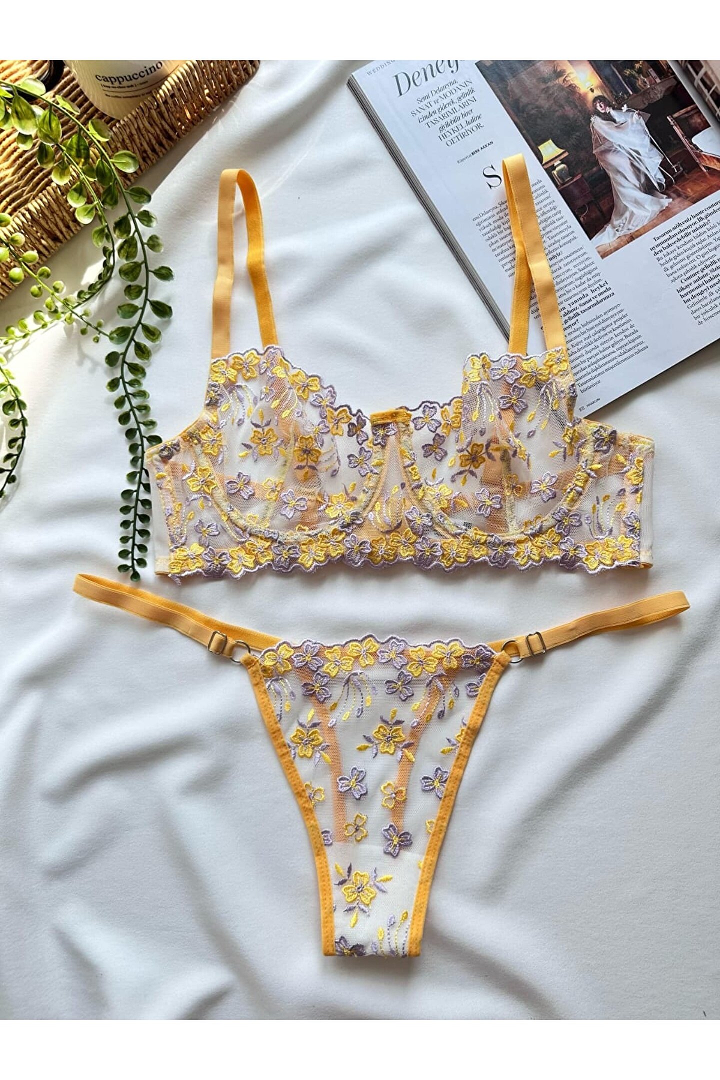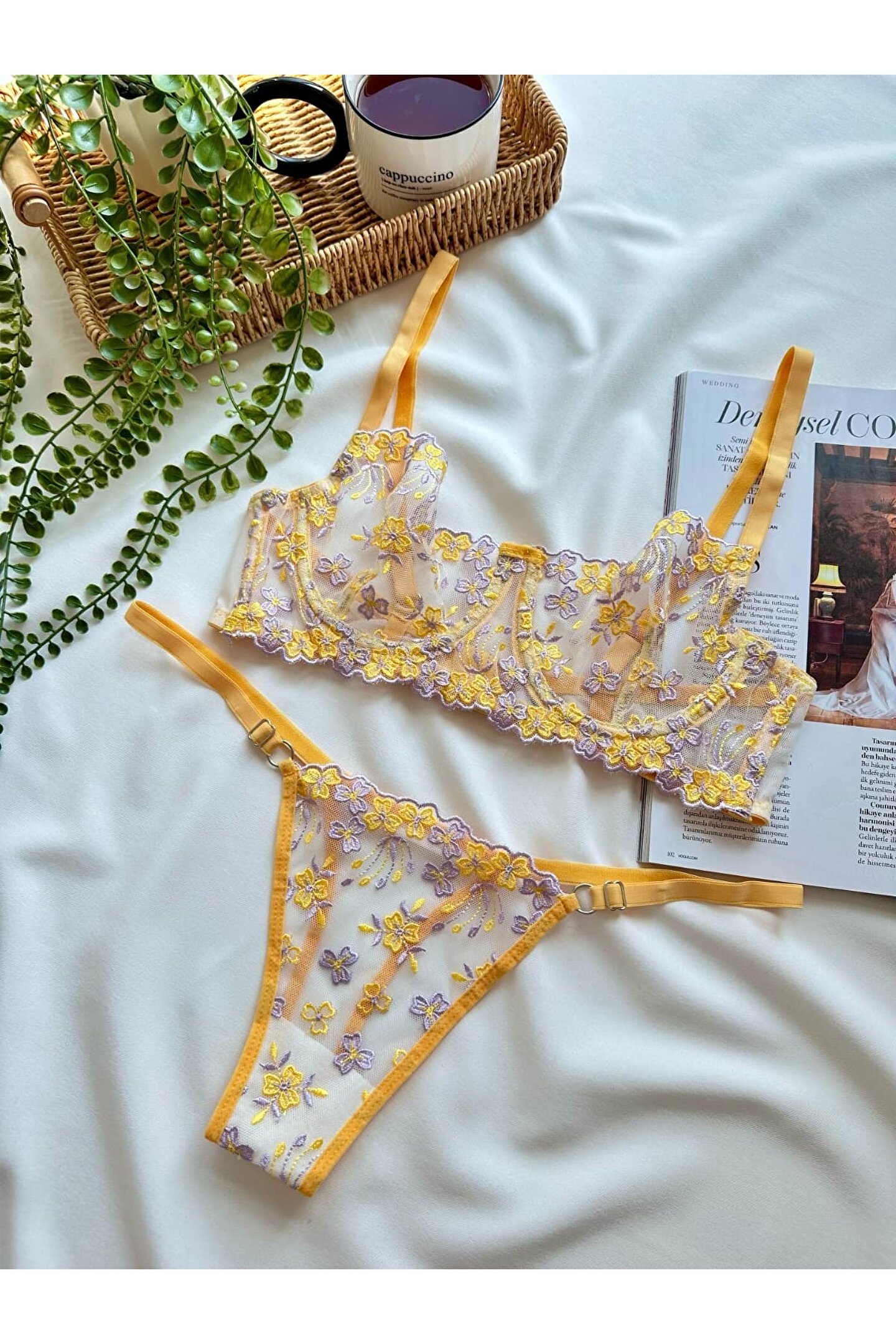 Sarı ve lilanın büyüleyici uyumuyla hazırlanmış çiçek işlemeli tül bralet takım, zarif ve romantik detaylarıyla iç giyim koleksiyonunuzun en özel parçalarından biri olmaya aday.; ; Hafif yapısı, yumuşak dokusu ve esnek formu sayesinde hem günlük kullanıma hem de özel anlara mükemmel uyum sağlar.; ; Transparan tül üzerine işlenen çok renkli çiçek motifleri, feminen bir görünüm sunarken; braletin rahat kalıbı ile gün boyu konfor sağlar.; ; Takımın uyumlu külodu ise aynı zarif işlemelerle bütünlüğü tamamlar.; ; Çiçek işlemeli tül detaylar ; Yumuşak yapılı ; Esnek ve rahat kalıp ; Hafif ve nefes alabilir kumaş ; Tamamlayıcı uyumlu külot ; Günlük kullanım ve özel günler için ideal ;