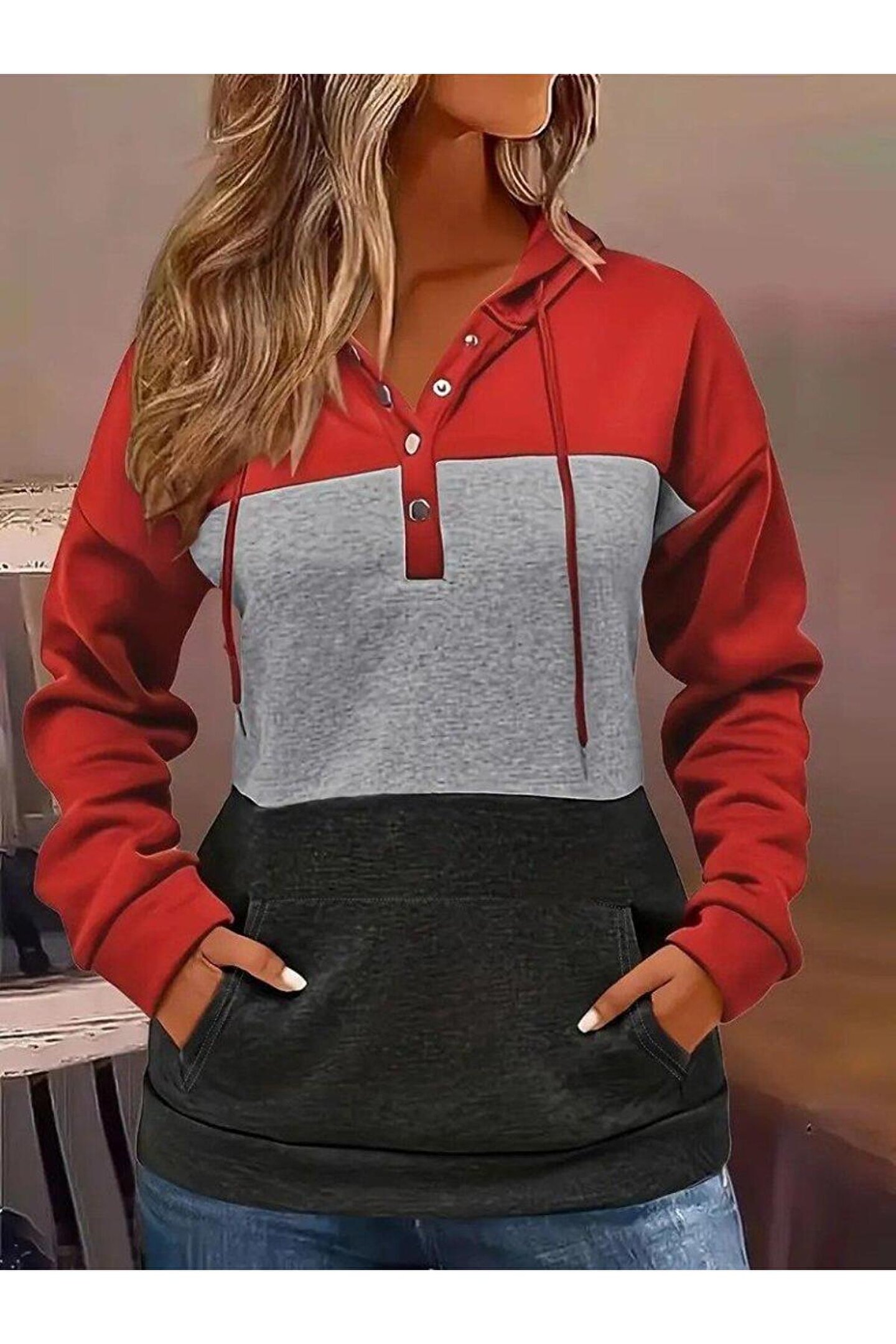 Kadın Uzun Kollu Kapşonlu çok Renkli Iki Iplik Bluz