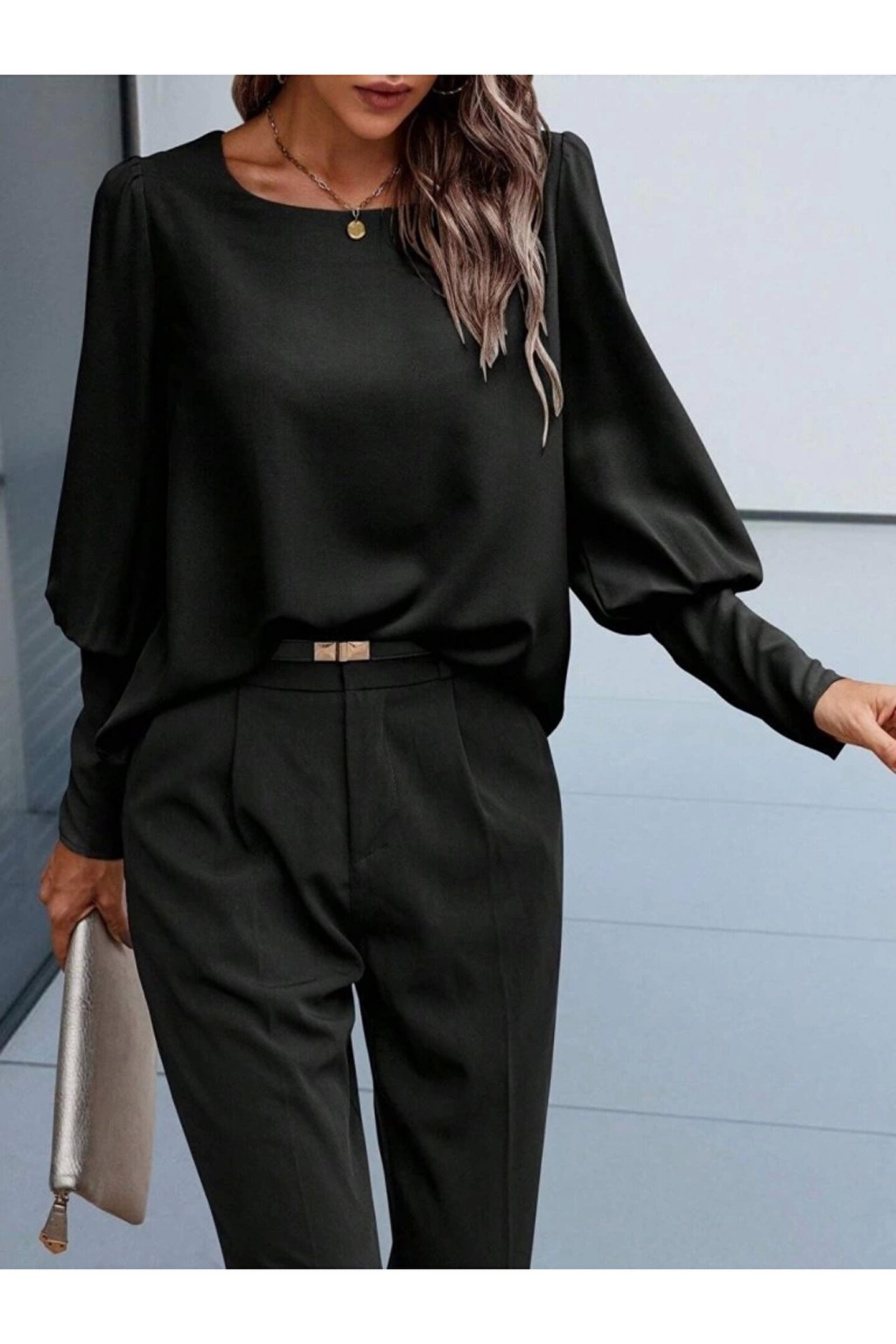 NOİR & GOLD Kadın Uzun Kollu Yuvarlak Yakalı Düğmeli Ithal Krep Bluz