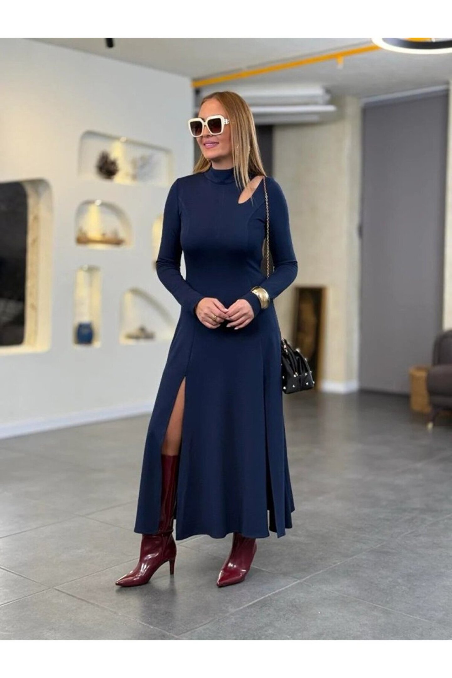EQURİ Kadın Balıkçı Yaka Damla Detaylı Yırtmaçlı Uzun Viskon Iki Iplik Maxi Elbise