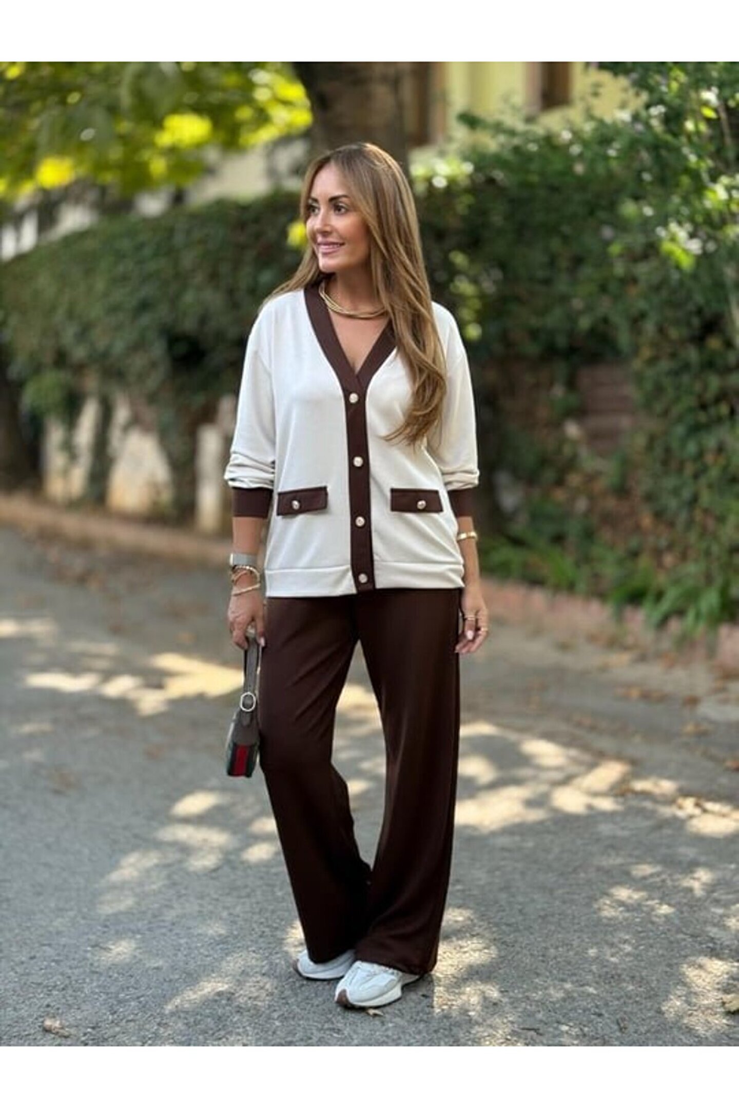 NORA Boutique EQURİ Kadın Uzun Kollu Ribanali Cep Detay Hırka Ve Bol Paça Pantolon Ikili Takım