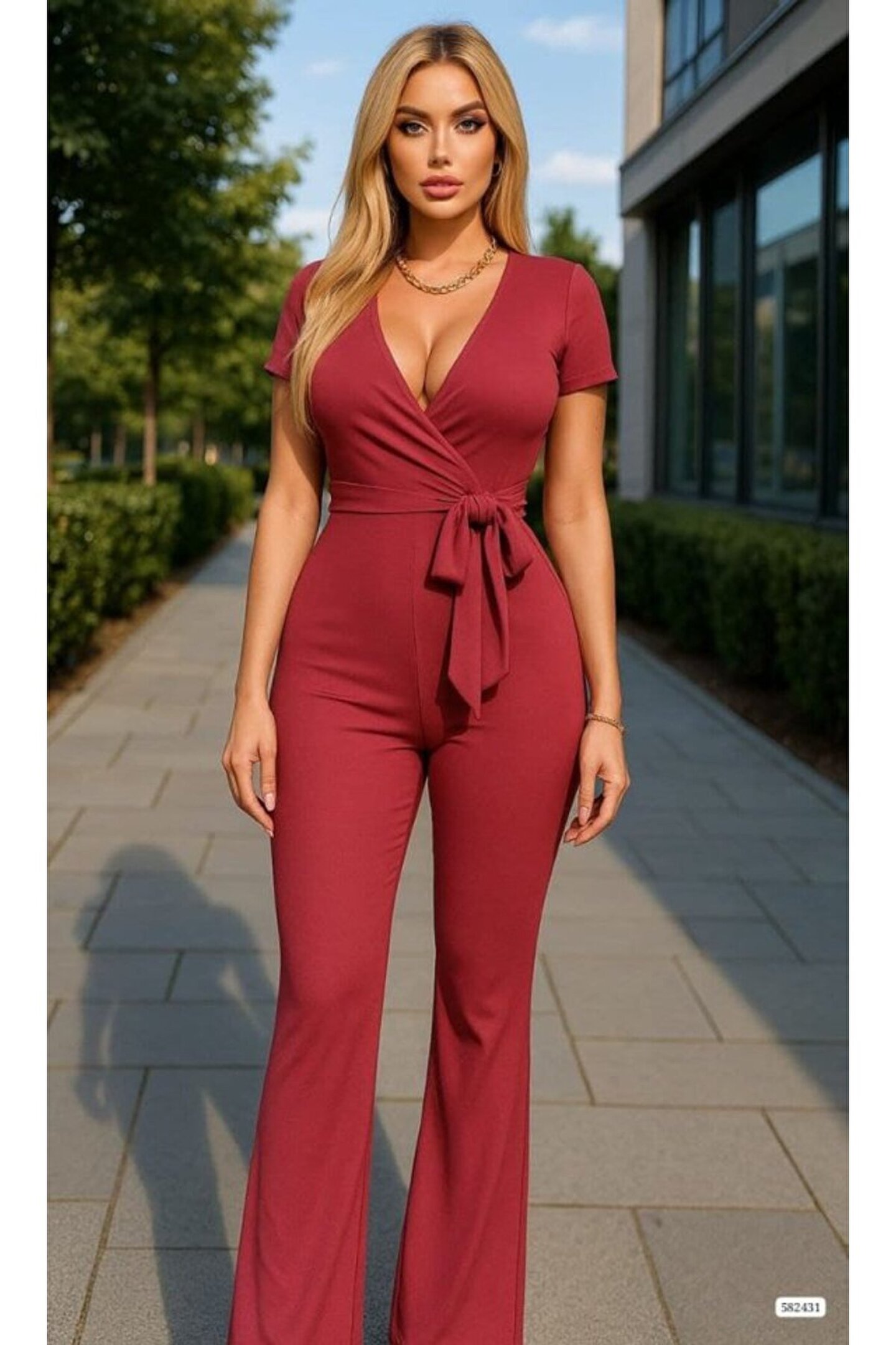 Edolika Kadın Kruvaze Yaka Kısa Kollu Kuşaklı Tulum