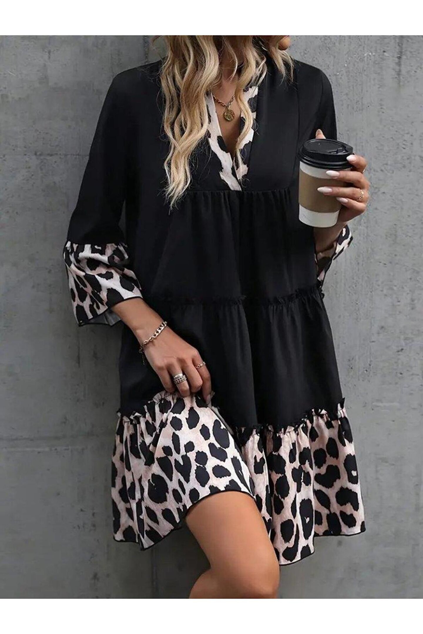 Kadın Fakir Kol V Yakalı Leopar Desen Detaylı Trikoton Elbise