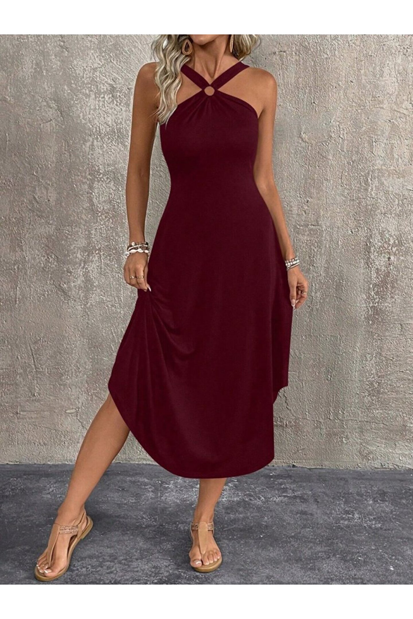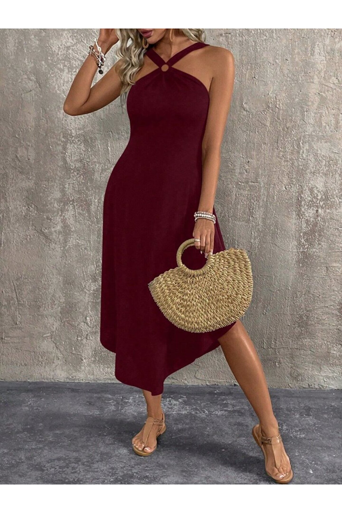 novafems EQURİ Kadın Boyundan çapraz Askılı Halka Detaylı Asimetrik Kesim Viskon Elbise