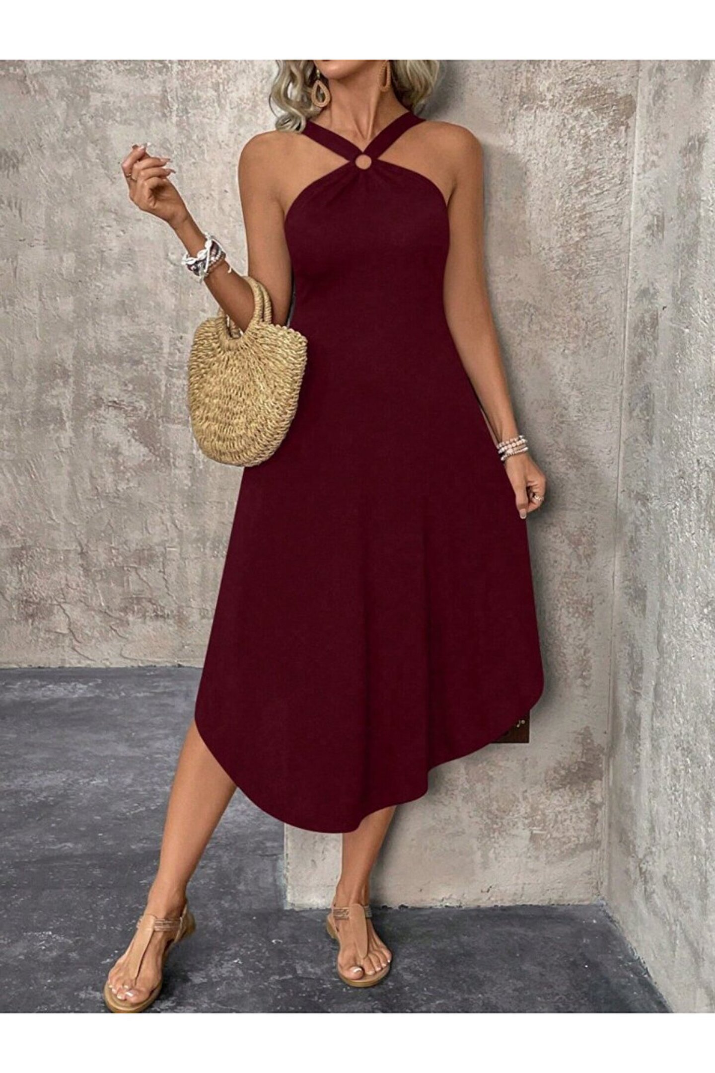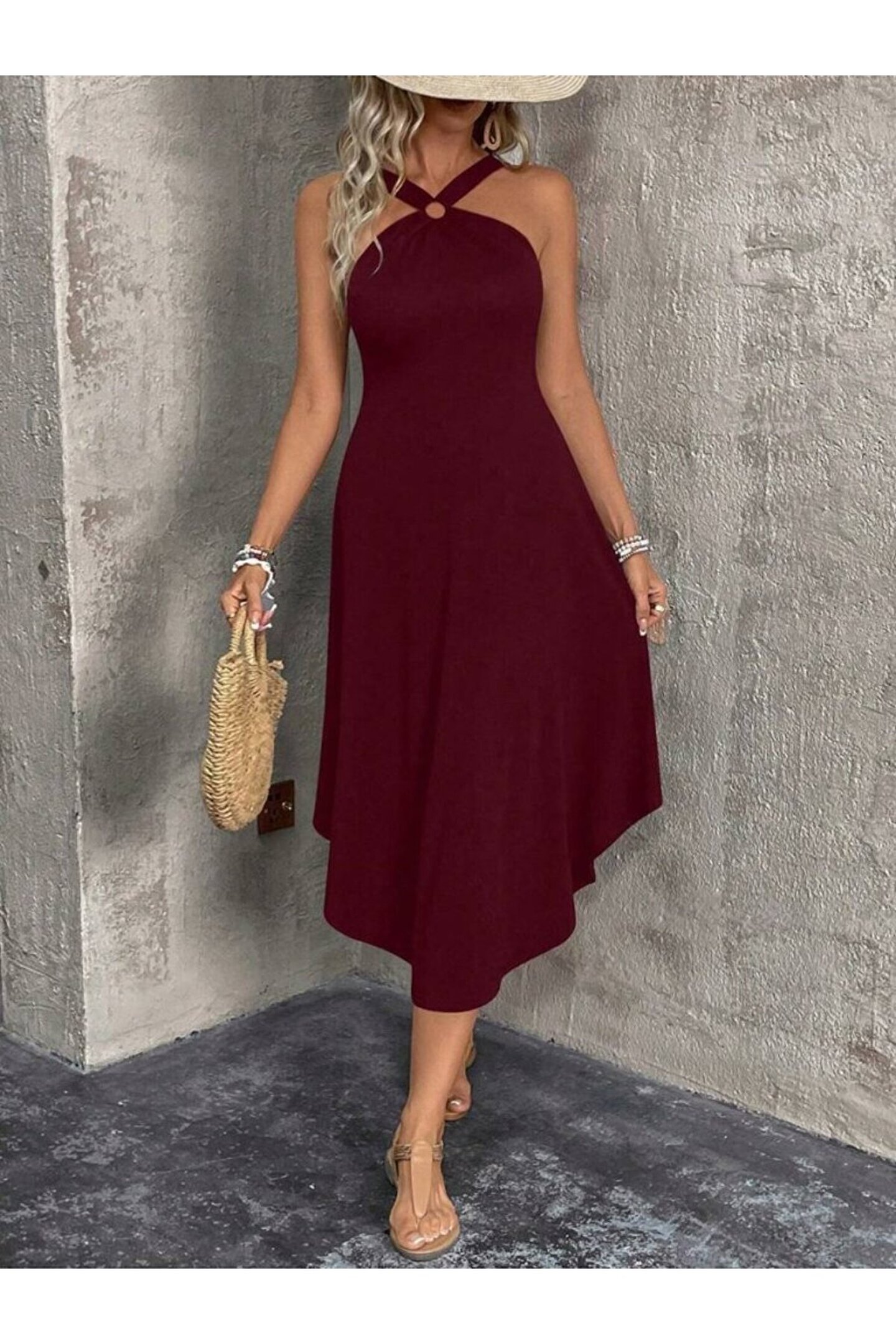 Kadın Boyundan çapraz Askılı Halka Detaylı Asimetrik Kesim Viskon Elbise