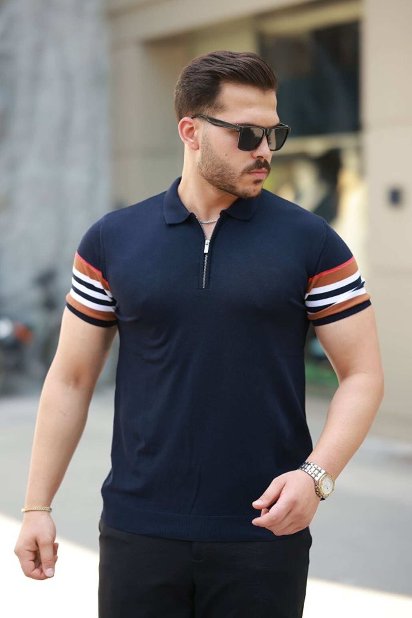 Erkek Fermuar Yakalı Kolları Desenli Kısa Kollu Tişört