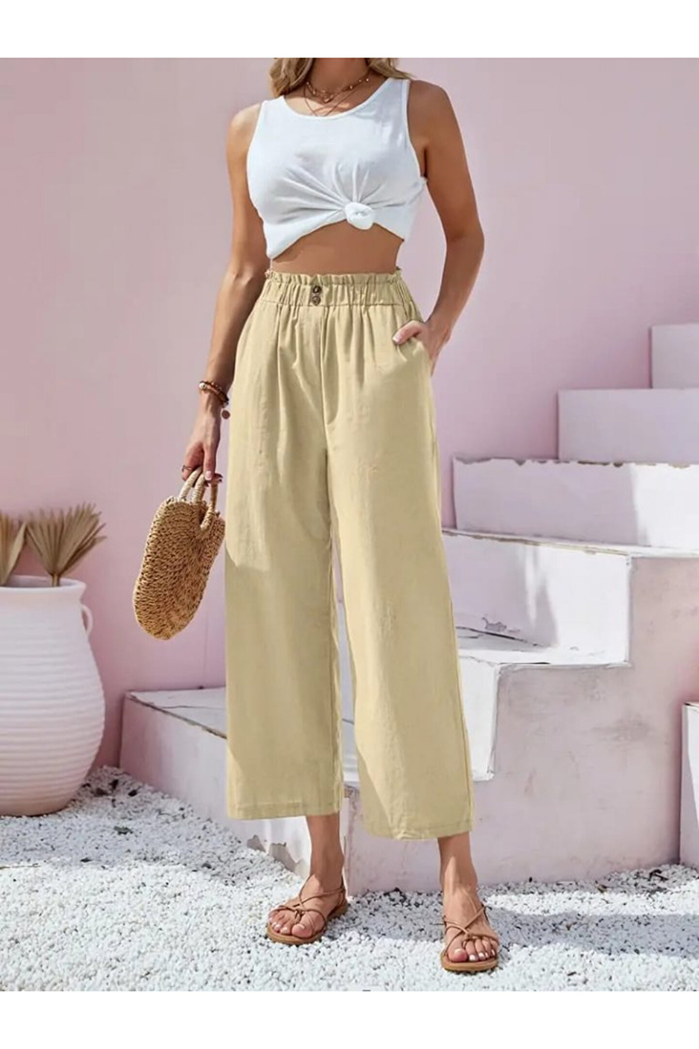 Kadın Bel Büzgü Ve Düğme Detay Kapri Keten Pantolon