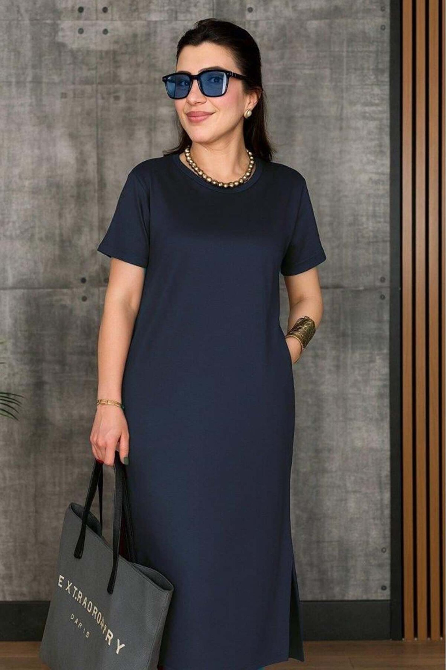 novafems Kadın Kısa Kollu Bisiklet Yaka Yırtmaçlı Viskon Iki Iplik Elbise