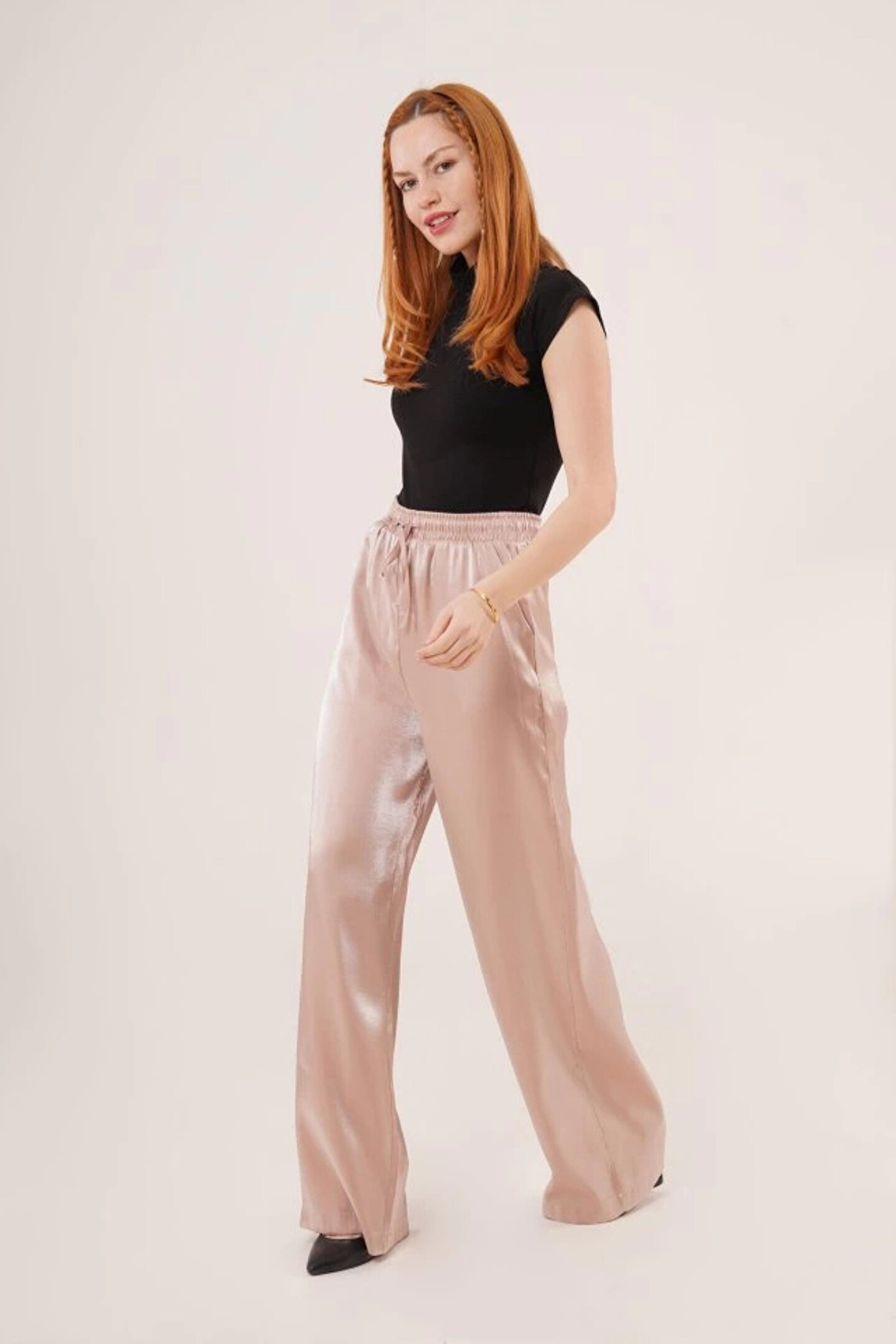 novafems Parlak Görünümlü Cepli Bej Bol Paça Pantolon