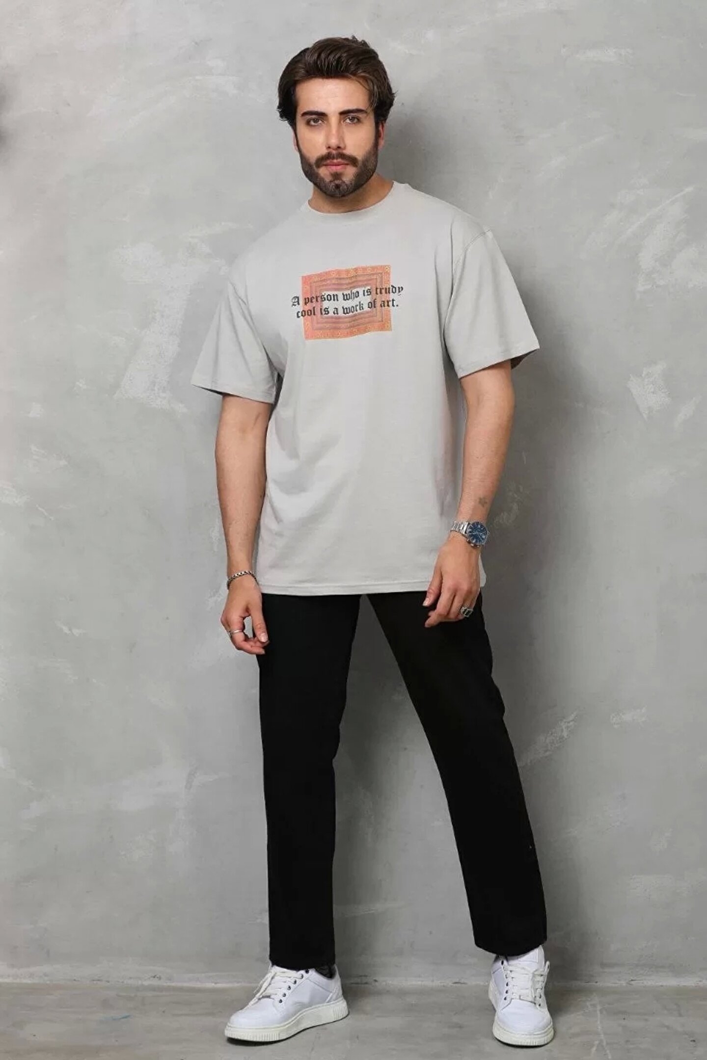 novafems Unisex Bisiklet Yaka Baskılı Oversize T-Shirt - Gri