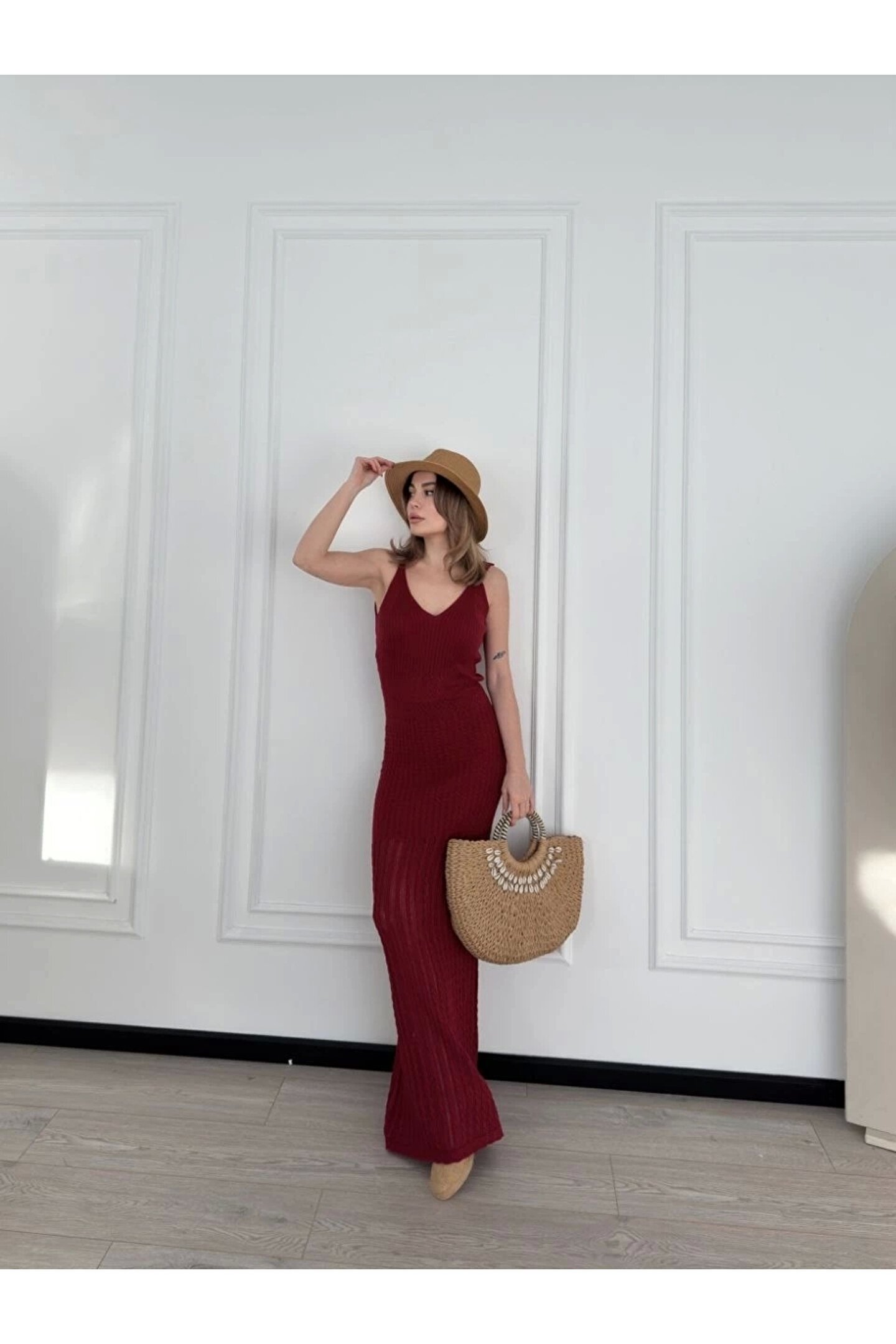 Örgülü Uzun Triko Elbise - Bordo